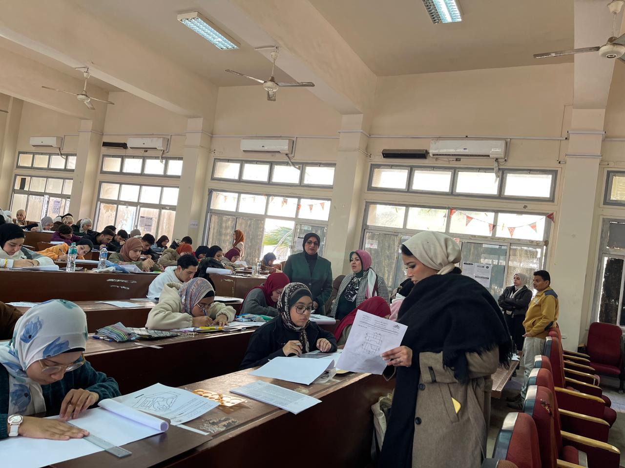 تحت رعاية معالي السيد الاستاذ الدكتور حمدان ربيع رئيس الجامعة والسيد الاستاذ الدكتور محمدعبده راغب عماشة نائب رئيس الجامعة لشؤون التعليم والطلاب تفقدت اليوم الاثنينالموافق5/1/2026 السيدة الاستاذة الدكتورة/غادة محمد الصياد عميد الكلية والاستاذة الدكتورة / عبيرحامد سويدان وكيل الكلية لشؤون التعليم والطلاب الامتحانات النظرية بالكلية للفصل الدراسي الاول للعام الجامعي 2026/2025 وذلك للاطمئنان على سير الامتحانات بانتظام والتزام.