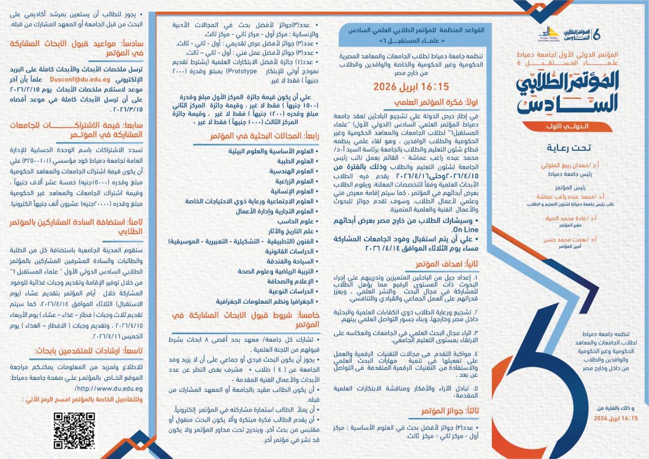 دعوة للمشاركة في المؤتمر الطلابي لجامعة دمياط ( علماء المستقبل 6 ) والدولي الاول يومي 15 و 16 أبريل 2026 لكل طلاب الجامعات والمعاهد المصرية الحكوميه والخاصة والأهلية والتكنولوجية والطلاب الوافدين والطلاب من خارج جمهورية مصر العربية.