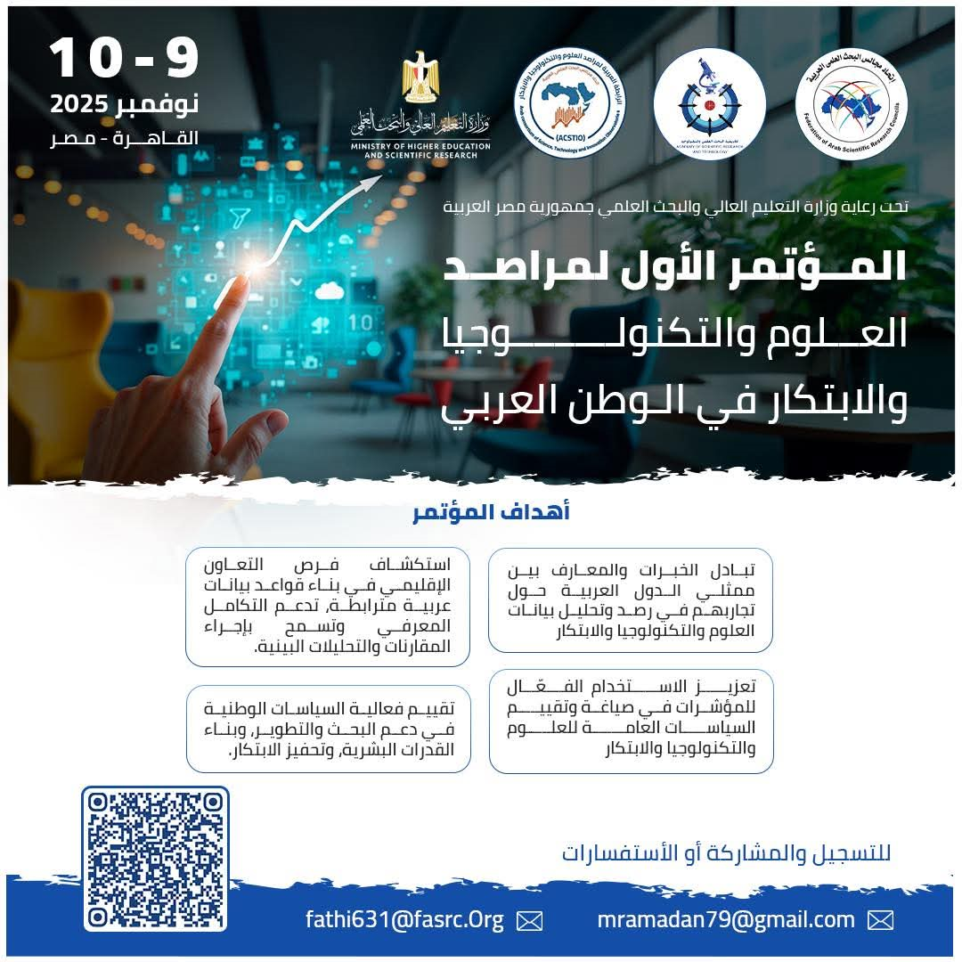 تعلن أكاديمية البحث العلمي والتكنولوجيا بالتعاون مع اتحاد مجالس البحث العلمي العربية عن انعقاد المؤتمر الأول لمراصد العلوم والتكنولوجيا والابتكار في الوطن العربي، وذلك يومي 9–10 نوفمبر 2025 بالقاهرة.