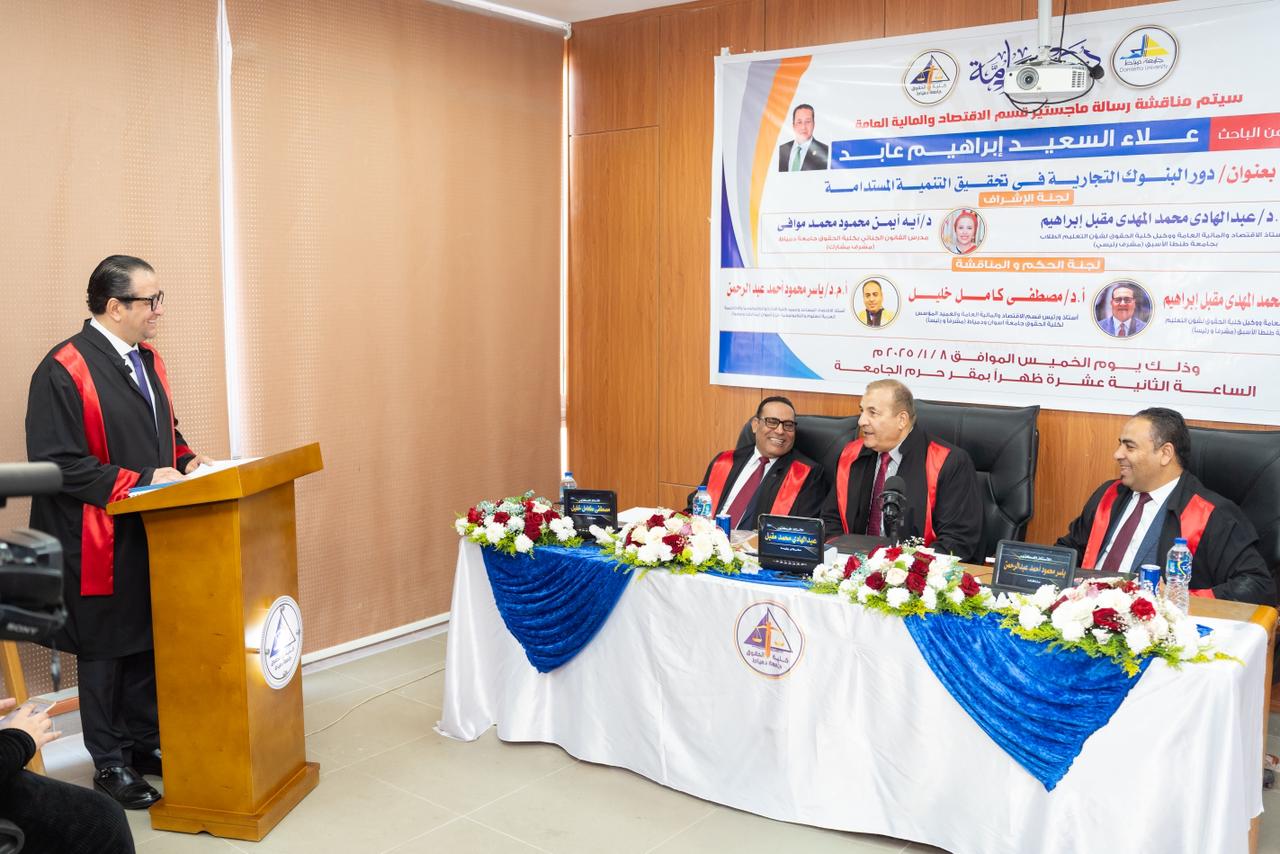وفي كلمته، أكد الأستاذ الدكتور حمدان ربيع، رئيس جامعة دمياط، أن موضوع الرسالة يأتي في توقيت بالغ الأهمية، في ظل تنامي الدور الذي تضطلع به المؤسسات المصرفية في دعم مسارات التنمية المستدامة، وتعزيز الاستقرار الاقتصادي وتحقيق الشمول المالي، مشيرًا إلى أن البحث العلمي في هذا المجال يمثل ركيزة أساسية لصياغة سياسات اقتصادية فعّالة تواكب التحديات الراهنة.