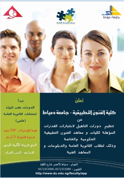 تعلن كلية الفنون التطبيقية - جامعة دمياط عن تنظيم دورات التأهيل لاختبارات القدرات المؤهلة لكليات ومعاهد الفنون التطبيقية الحكومية والخاصة وذلك لطلاب الثانوية