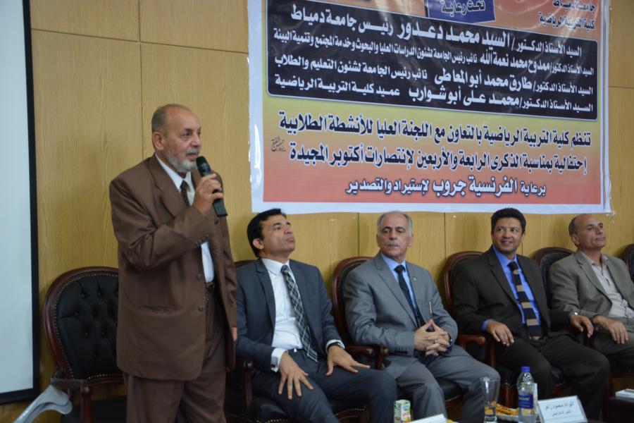 ولقد نظمت كلية التربية الرياضية الحدث بالاشتراك مع اللجنة العليا للأنشطة الطلابية الاحتفالية وقام برعاية الحفل (الفرنسية جروب للاستيراد والتصدير)، وبحضور بعض من أبطال حرب أكتوبر المجيد من أبناء محافظة دمياط وكانوا ضيوفاً اعزاء علي قلوب جميع الحضور وهم، معالي اللواء / محمود زاهر – الخبير الأمني الاستراتيجي ، ومعالي اللواء / محسن هندام رئيس مجلس إدارة جمعية العسكرين القدماء بمحافظة دمياط ، السيد الرائد/ اسلام الحداد عضو جمعية العسكرين القدماء ، جندي مقاتل/ عادل عبد العزيز صالح ، جندي مقاتل/ النبوي جوهر ، جندي مقاتل/ فتحي موسي ، جندي مقاتل/ السيد المريح ، جندي مقاتل/ عبد السلام أبو العطا، جندي مقاتل/ عبده شحم ، جندي مقاتل/ ممدوح رجب ، جندي مقاتل/ محمد نور الدين ، جندي مقاتل/ جودت العزبي.
