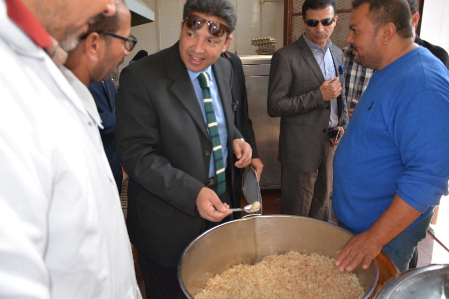 ثم توجه سيادته للمدينة الجامعية (بنين) لمتابعة سير العمل بالمدينة وكذلك تقديم وجبة الغداء للطلاب، كما ناقش سيادته الطلاب المتواجدين آنذاك عما اذا كان لديهم أية ملاحظات علي الإقامة او الوجبات المقدمة أم لا، وأثني الطلاب علي مستوي الخدمات المقدمة بالمدينة الجامعية.