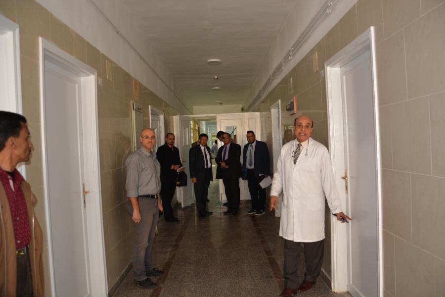 ثم اصطحبوا سيادته في جوله تعريفيه بالمستشفى وتبين أثناء الجولة أن المستشفى علي مساحة (12 الف متر مربع) ويوجد بها عدد (214) سرير لاستقبال المرضي (7) أسرة عناية مركزه (14) حضانة للأطفال حديثي الولادة (25) ماكينة غسيل كلوي ومخصص منها عدد لحاملي فيرس (C) وغرف خاصة بالأشعة المقطعية والسونار، أيضاً بنك الدم ,الذي يحتوي على أجهزة لفصل البلازما وثلاجات خاصة بحفظ أكياس الدم، بالإضافة الي المحرقة لإعدام المعدات المستهلكة والخاصة بالمرضي ، وأيضاً المشرحة وتحتوي علي ثلاجة لحفظ الموتى وبها ست عيون ، وأوضح الدكتور /الخطيب لرئيس الجامعة أن المستشفى بها غرف للأطباء المقيمين ، كما يوجد قسم الحروق ويوجد به غرف العناية المركزة والخاصة بالحروق.