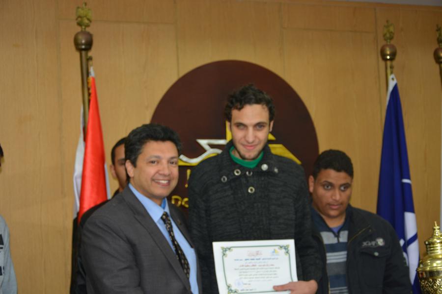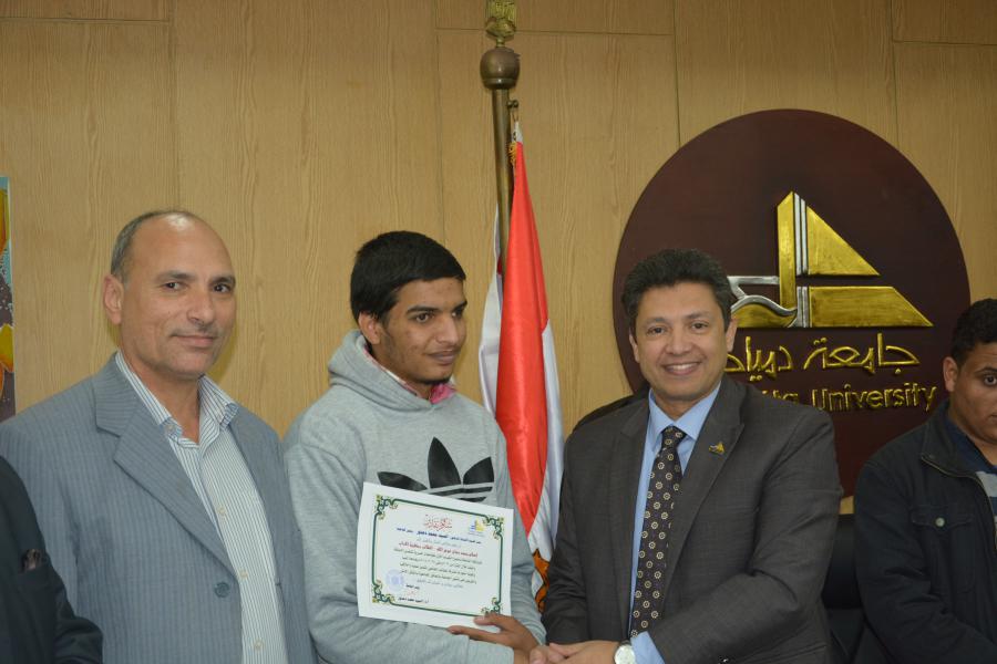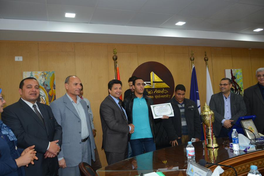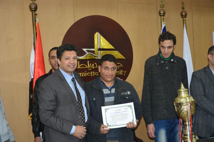 كرم اليوم السيد أ.د/ السيد محمد دعدور - رئيس الجامعة وبحضور كلٍ من السيد أ.د/ ممدوح محمد نعمة الله – نائب رئيس الجامعة لشئون الدراسات العليا والبحوث ، والسادة عمداء الكليات ، والسيد م/ أمين عام الجامعة الطلاب الذين شاركوا فى أسبوع شباب الجامعات الأول لمتحدي الإعاقة بجامعة المنيا تحت عنوان " بالتحدي نستطيع " كما قام السيد أ.د/ رئيس الجامعة بتقديم شهادات تقدير للطلاب المشاركين بالأسبوع وكذلك دبوس يحمل " شعار جامعة دمياط "