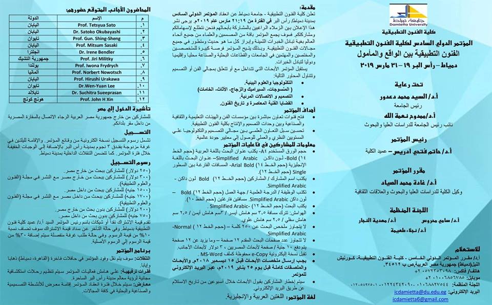تعلن كلية الفنون التطبيقية - جامعة دمياط عن انعقاد المؤتمر الدولي السادس تحت عنوان " الفنون التطبيقة بين الواقع والمأمول "