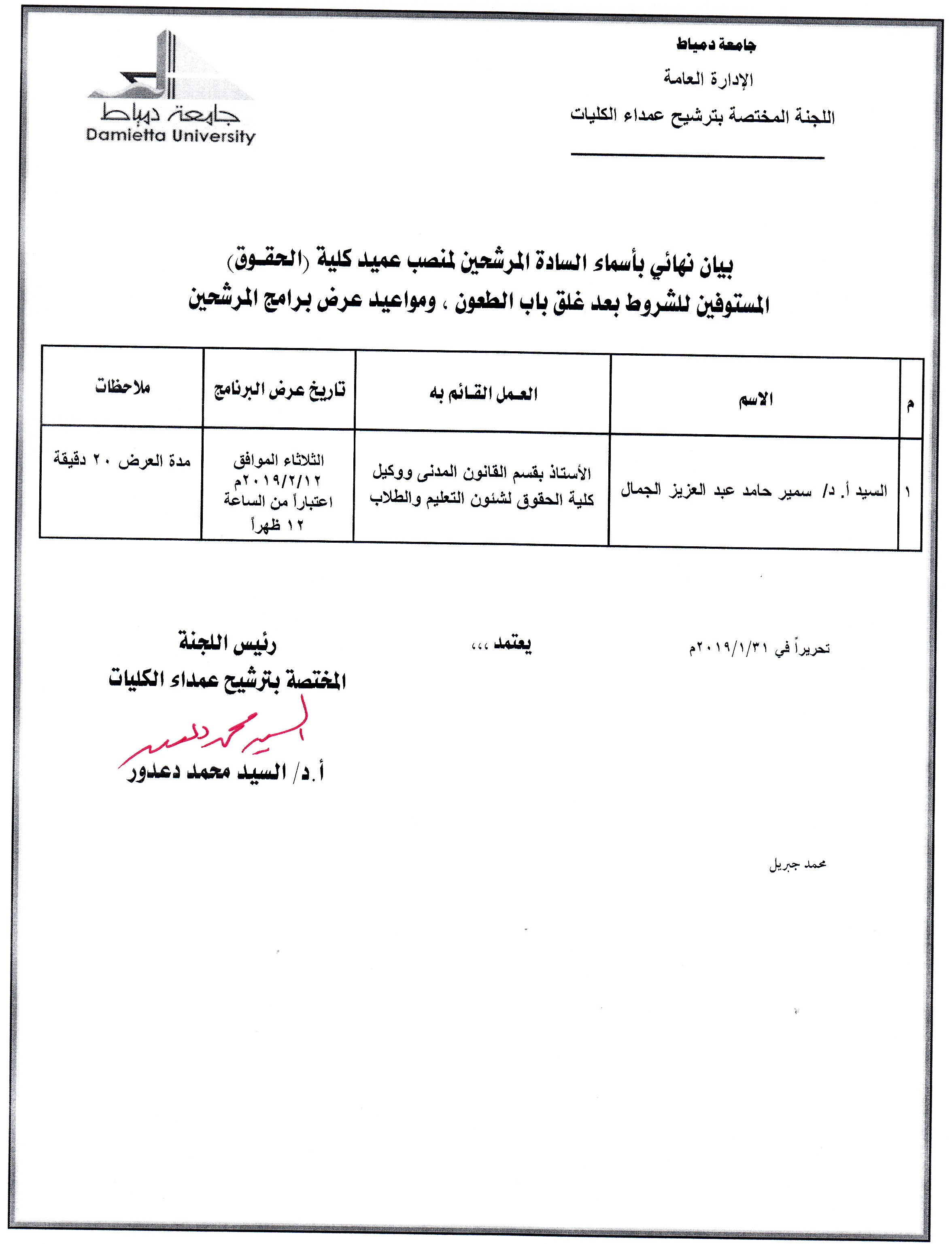 البيان النهائي للسادة المرشحين لمنصب عميد (كلية الحقوق)