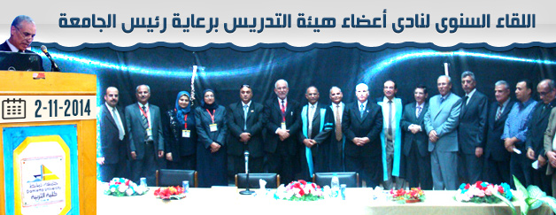 انعقد يوم الأحد2/11/2014، اللقاء السنوى لنادى أعضاء هيئة التدريس بحضور السيد أ.د/ رمضان الطنطاوى – رئيس الجامعة، والسيد أ. د/ السيد سلامة الخميسي – رئيس مجلس إدارة النادي، والسادة أعضاء النادي وعدد كبير من السادة أعضاء هيئة التدريس والهيئة المعاونة، وناقش اللقاء بعض الموضوعات المتعلقة بالجامعة والنادى.