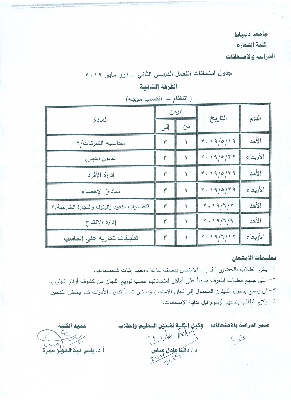 أعلنت إدارة كلية التجارة بجامعة دمياط عن جدول امتحانات الفصل الدراسى الثانى - دور مايو 2019 لطلاب الفرقة الثانية (انتظام - انتساب موجه )