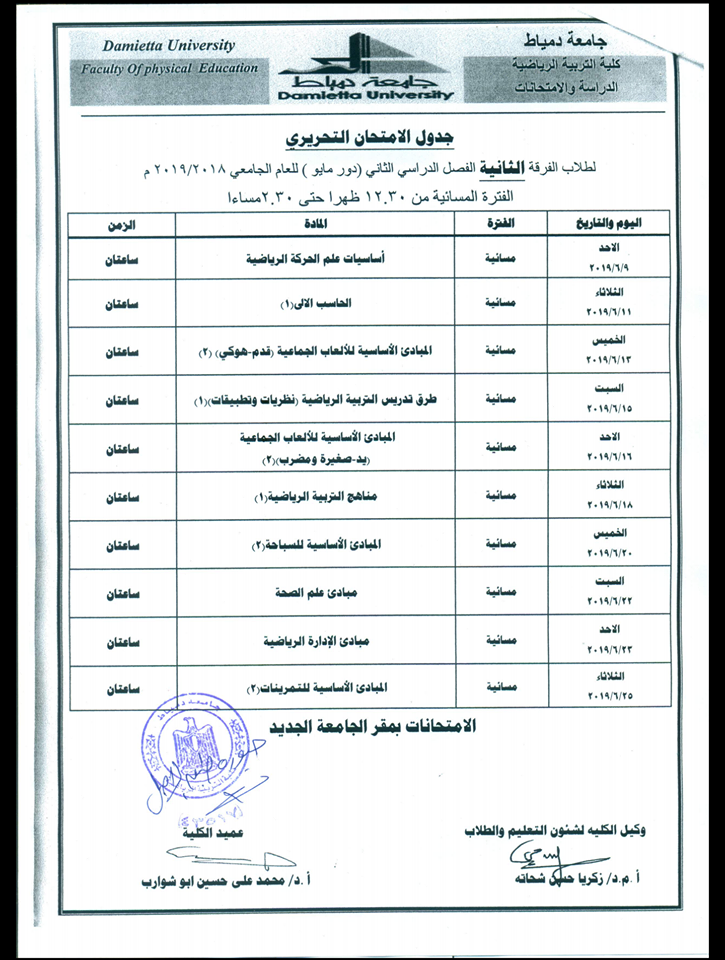 أعلنت إدارة كلية التربية الرياضية عن جدول الامتحانات التحريرى للفصل الدراسى الثانى لطلاب الفرقة الثانية (جميع الشعب ) دور مايو للعام الجامعى 2019/2018م