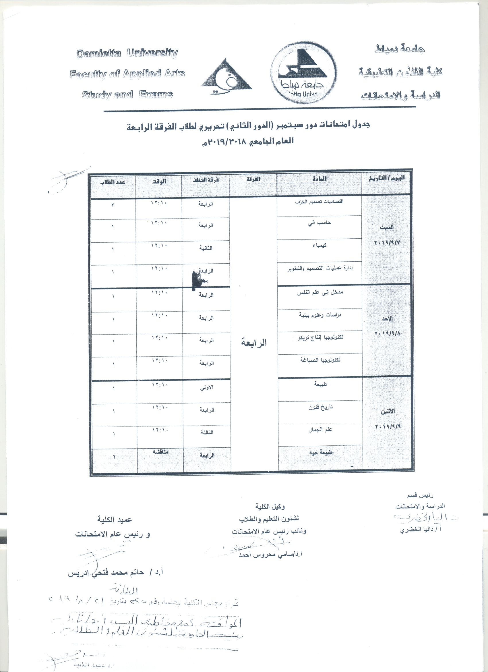 جدول امتحانات دور سبتمبر بكلية الفنون التطبيقيةجامعة دمياط | البوابة الالكترونية
