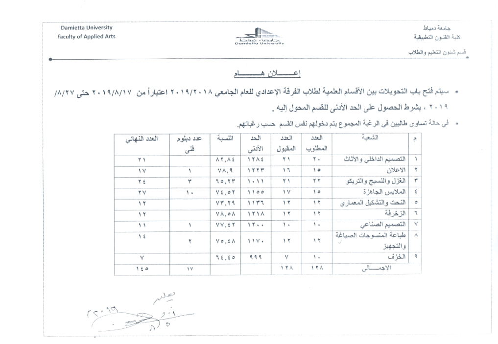 سيتم فتح باب التحويلات بين الأقسام العلمية لطلاب الفرقة الإعدادي للعام الجامعي 2019/2018 اعتباراً من 2019/8/17 و حتى 2019/8/27