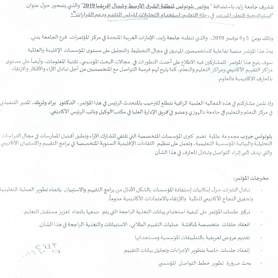 تتشرف جامعه زايد باستضافه مؤتمر بلونوتس لمنطقه الشرق الاوسط وشمال افريقيا 2019 وذلك يومي 5-6 نوفمبر 2019 بجامعه زايد بالامارات العربيه المتحدة بفرع الجامعه بدبي
