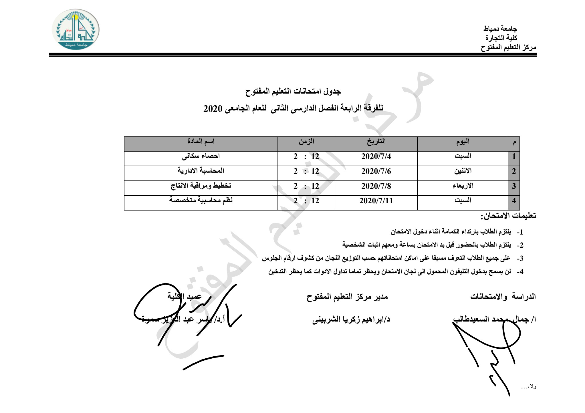 كلية التجارة من 4/7/2020 إلى 11/7/2020.