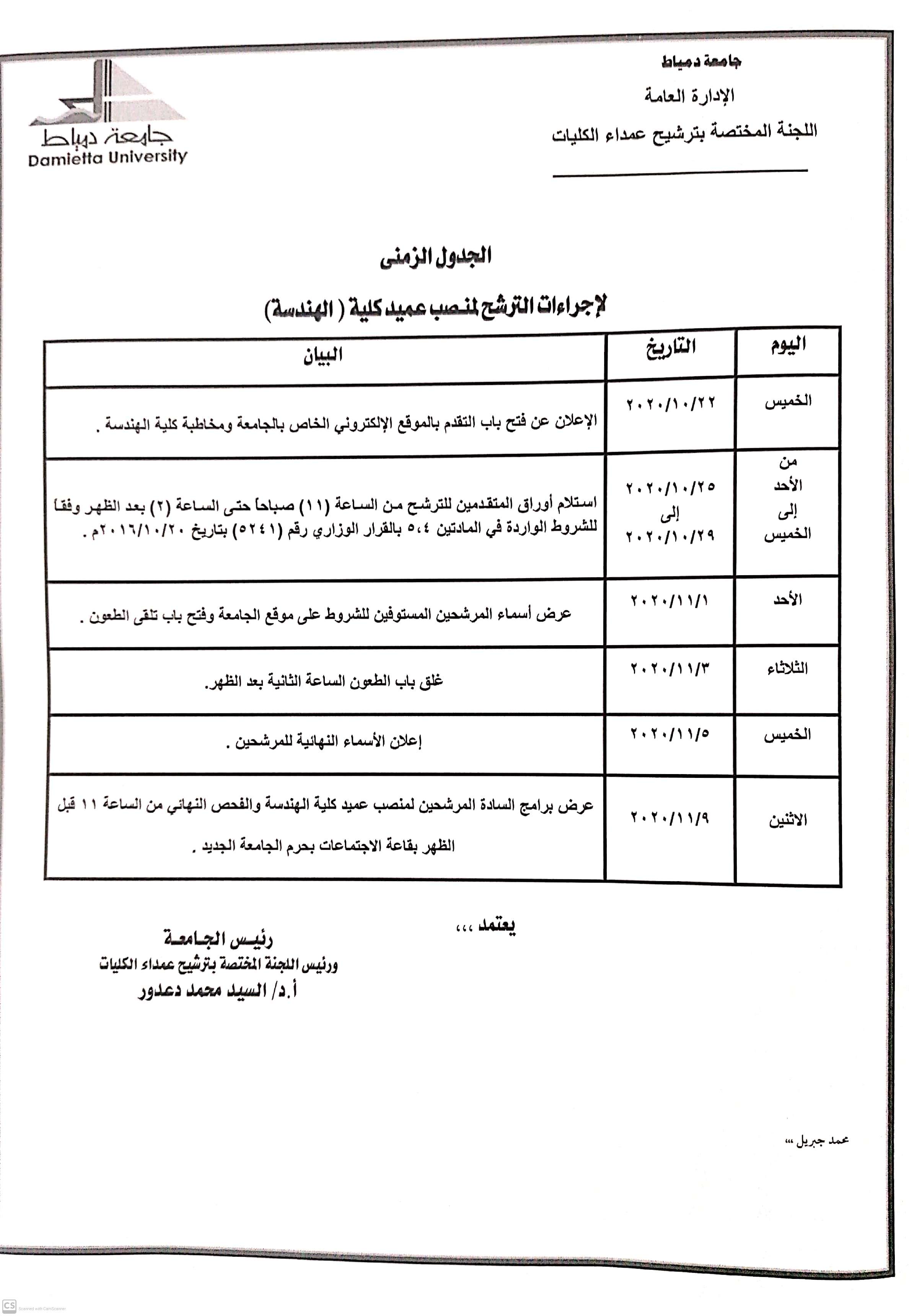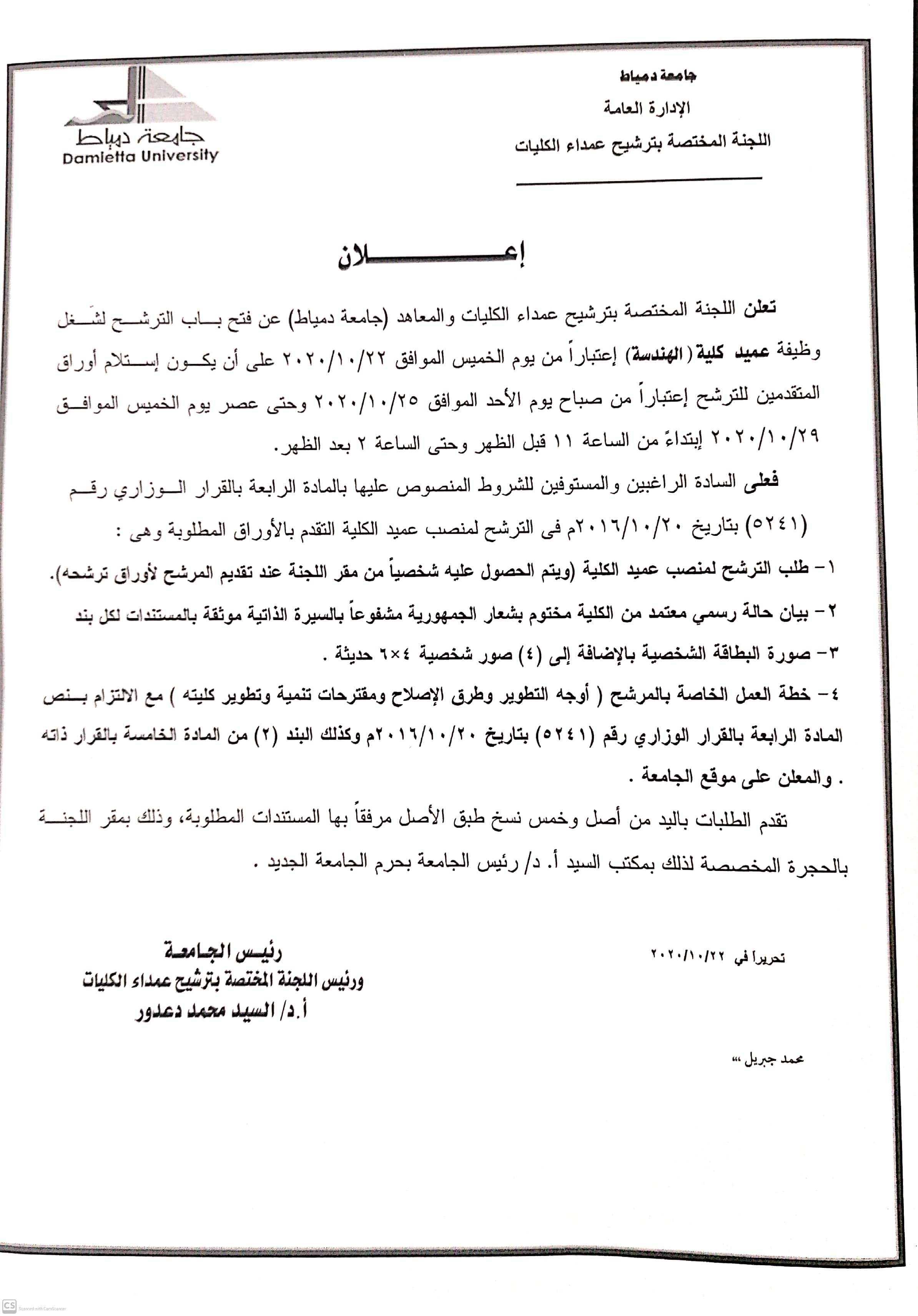 تعلن اللجنة المختصة بترشيح عمداء الكليات والمعاهد (جامعة دمياط) عن فتح باب الترشح لشغل وظيفة عميد كلية الهندسة على النحو التالي: