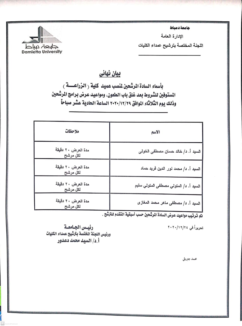تعلن اللجنة المختصة بترشيح عمداء الكليات بجامعة دمياط عن بيان بأسماء المرشحين لمنصب عميد كلية الزراعة المستوفين للشروط بعد غلق باب الطعون ومواعيد عرض برامج المرشحين، وذلك على النحو التالي: