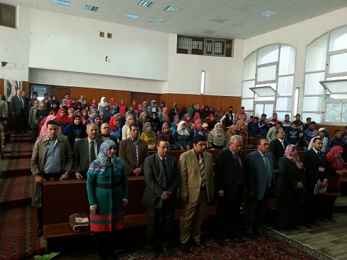ثم توجه سيادته والسادة الحضور لمسرح كلية التربية لعرض الكليات ما تم انجازه خلال الثلاثة شهور المنقضية ، بدأ الملتقي بوقوف الجميع دقيقة حداد لوفاة الآنسة / فوزية أسعد غريب – المعيدة بقسم الاقتصاد بكلية التجارة ، وشقيقها في حادث سيارة ، للفقيدان الرحمة ولأسرتهم الصبر والسلوان.