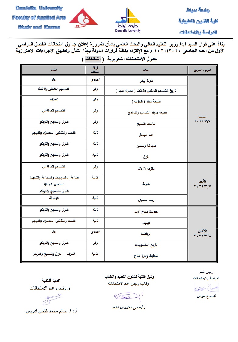 أعلنت إدارة كلية االفنون التطبيقية بجامعة دمياط عن الإعلان عن جدول الامتحانات التحريرية (التخلفات) للفصل الدراسى الاول من العام الجامعى 2020/2021 اضغط هنا
