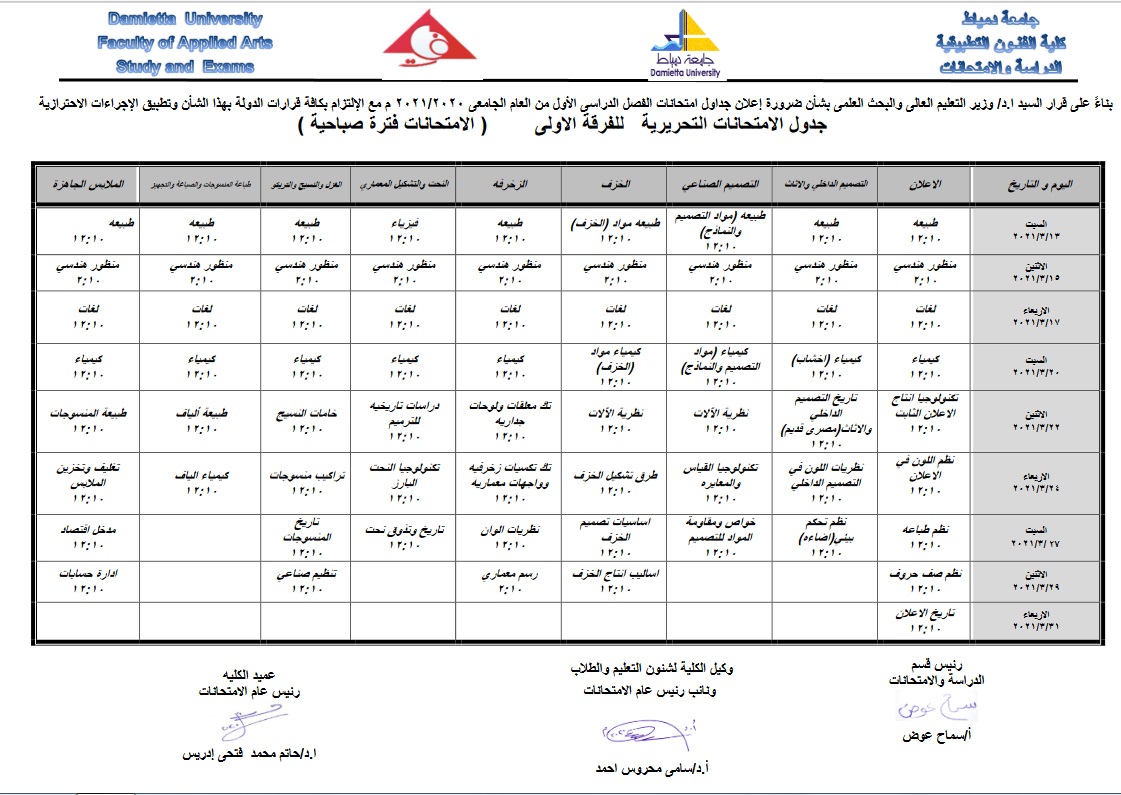 أعلنت إدارة كلية االفنون التطبيقية بجامعة دمياط عن الإعلان عن جدول الامتحانات التحريرية (الفرقة الأولى ) للفصل الدراسى الاول من العام الجامعى 2020/2021 اضغط هنا