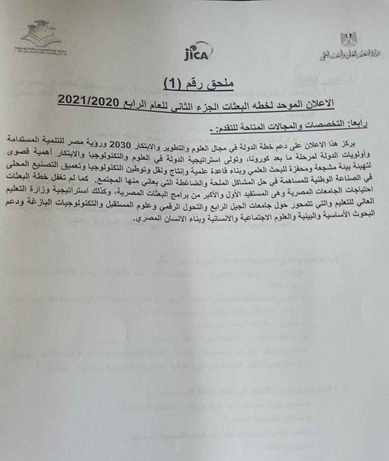 أعلن قطاع الشئون الثقافية والبعثات بوزارة التعليم العالي عن موافقة السيد الأستاذ الدكتور معالى الوزير على الإعلان عن الجزء الثاني من خطة البعثات للعام الرابع 2020 / 2021 من الخطة الخمسية الثامنة 2017 - 2022 بالنظام التنافسي ليكون إعلان موحد لجميع البرامج التي تقدمها البعثات، وذلك اعتبارًا من 21 / 3/ 2021 حتى 30/ 5/ 2021