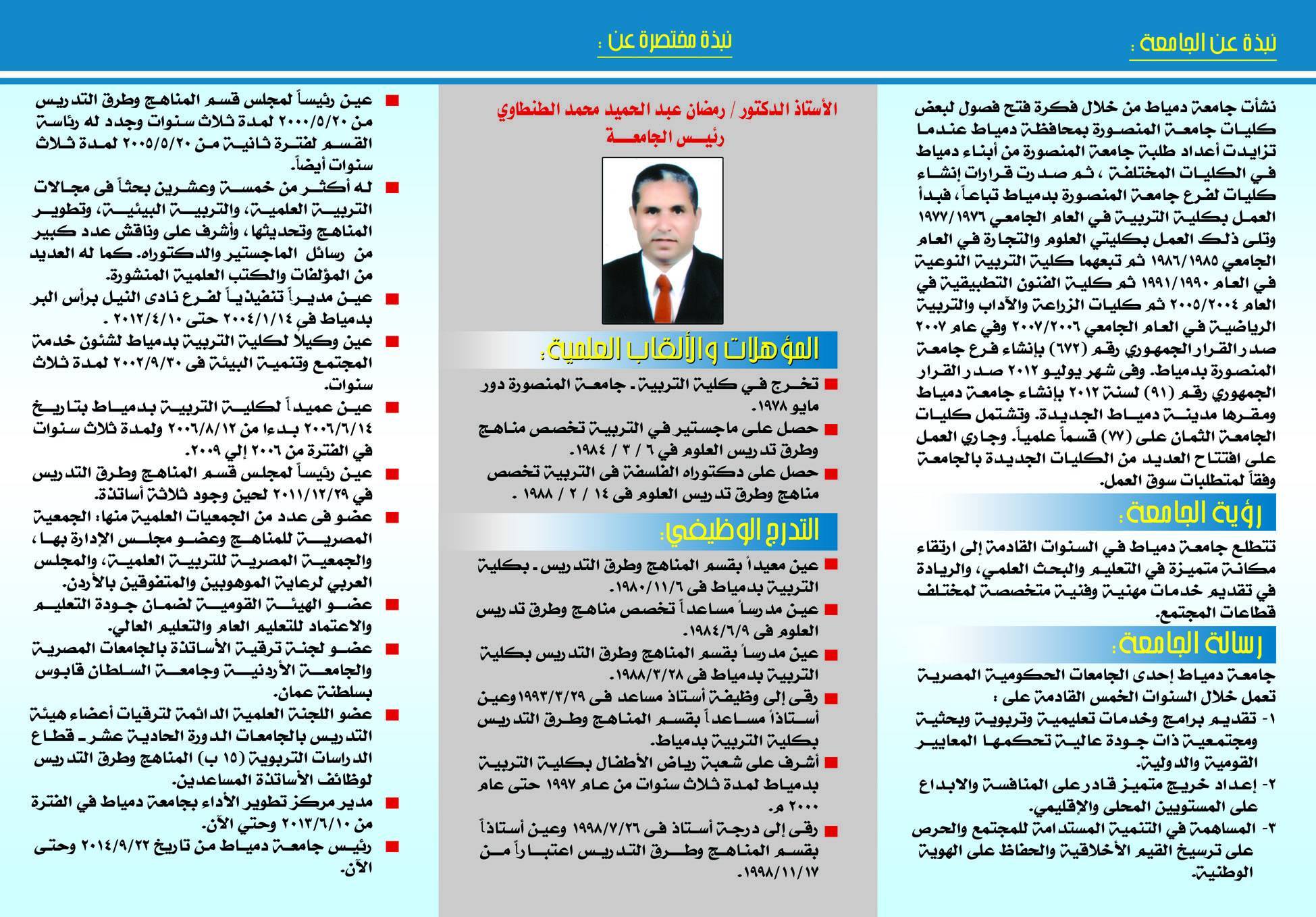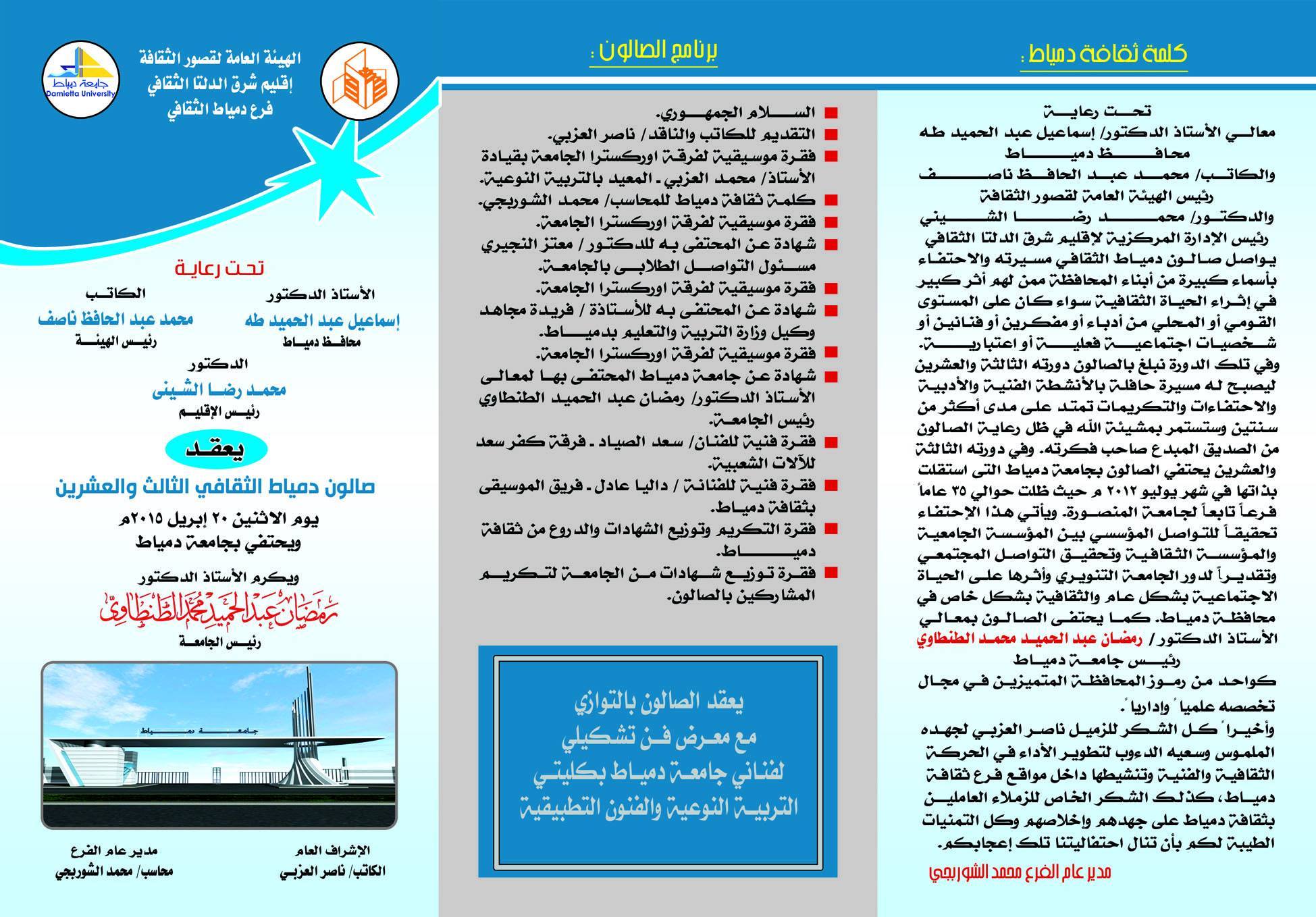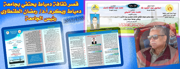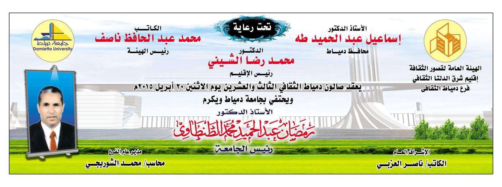 يعقد غداً الاثنين 20/4/2015 بقصر ثقافة دمياط صالون دمياط الثقافى الـ 23 ويحتفي بجامعة دمياط ويكرم الأستاذ الدكتور/ رمضان عبد الحميد محمد الطنطاوي – رئيس الجامعة.