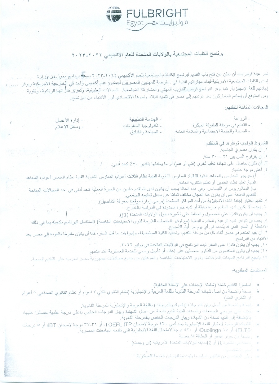 تُعلن هيئة فولبرايت عن فتح باب التقدم لبرنامج الكليات المجتمعية للعام الأكاديمي 2022 - 2023 وهو البرنامج الذي يتم الإعلان عنه بشكل سنوي ويوفر الفرصة للمهنيين المصريين لحضور عام أكاديمي واحد في إحدى الكليات المجتمعية الأمريكية لبناء مهاراتهم الفنيه في المجالات التطبيقية وتعزيز قدراتهم الريادية وتقوية إجادتهم للغة الإنجليزية وتوفير فرص للتدريب المهني والمشاركة المجتمعية