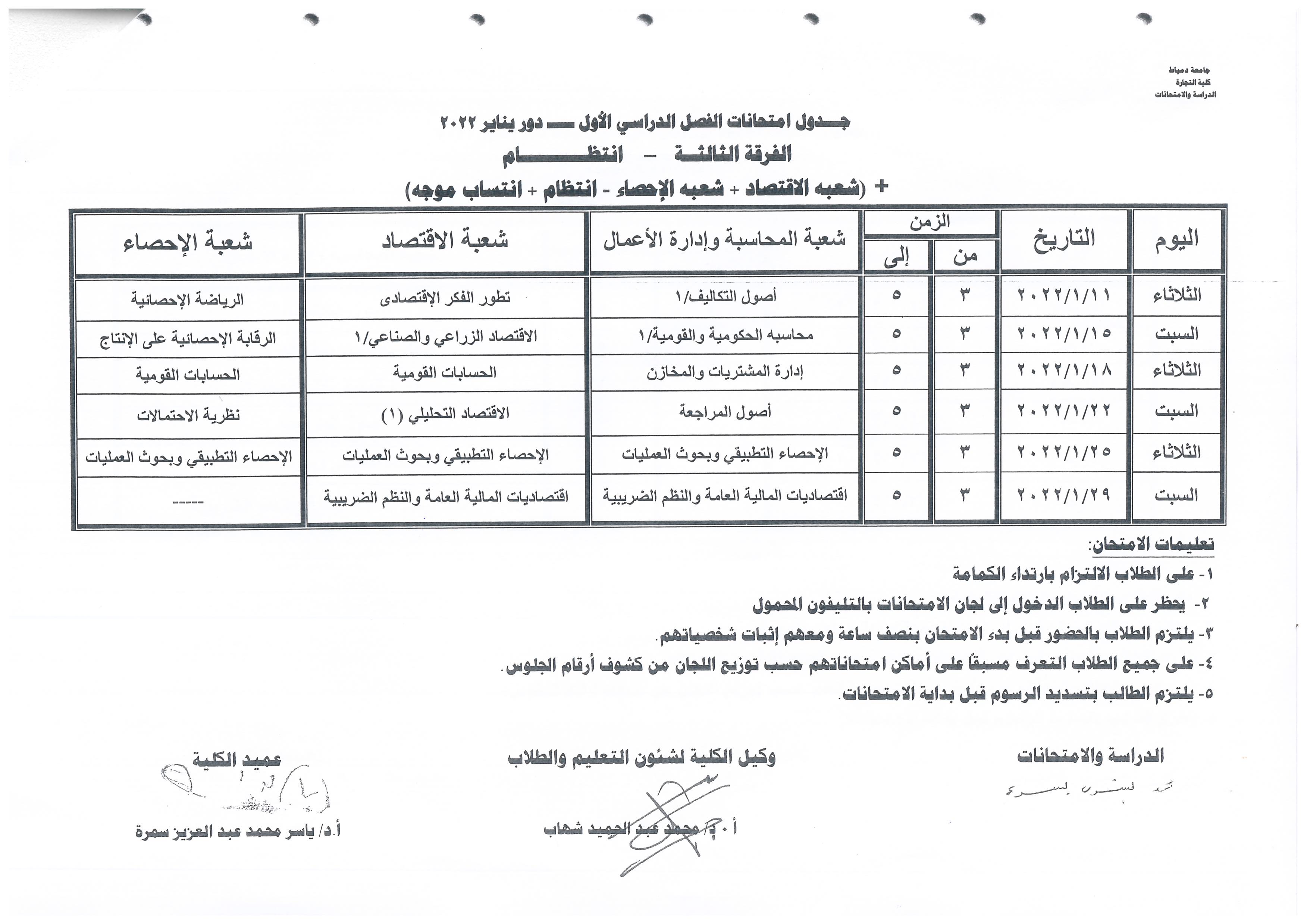 أعلنت إدارة كلية التجارة بجامعة دمياط عن جدول امتحانات الفصل الدراسى الاول للعام الجامعى 2022/2021 الفرقة الثالثة (انتظام - انتساب موجه - شعبة اللغة الانجليزية )