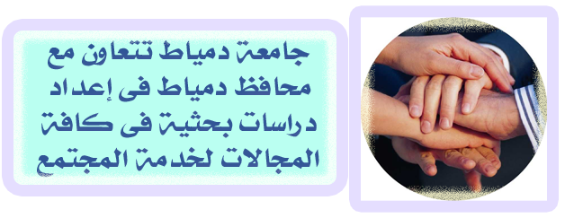 فى إطار التنسيق والتعاون الدائم بين جامعة دمياط وديوان عام المحافظة وفى سبيل تطبيق الهدف الثالث من أهداف الجامعة والذي تسعى لتطبيقه بصورة فعالة وهو "خدمة المجتمع وتنمية البيئة" وبصفته الركيزة الثالثة للجامعة مع التعليم والبحث العلمي، وفى إطار اعتبار السيد أ.د.م/ إسماعيل عبد الحميد طه – محافظ دمياط بأن الجامعة مستشار المحافظة فى كافة المشروعات التنموية والمبادرات المجتمعية فى سبيل تحقيق التنمية المستدامة على أرض دمياط، قد قامت الجامعة برئاسة السيد أ.د/ رمضان الطنطاوى بالبدء فى تشكيل فرق عمل من كافة كليات الجامعة لإعداد وتجهيز دراسات مختلفة تخص المجتمع المدنى بالمحافظة، وتشمل هذه الدراسات ما يلي: