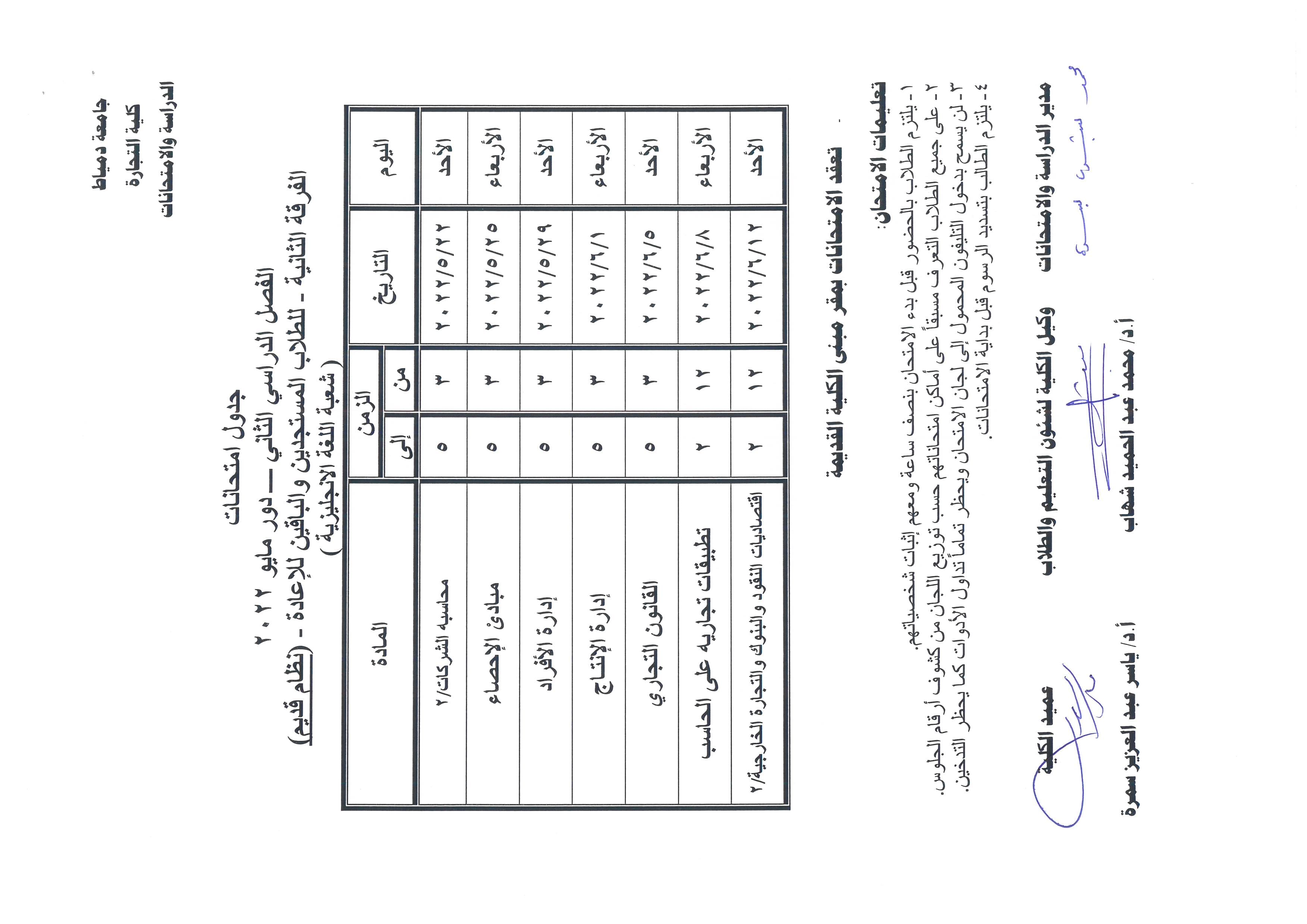 أعلنت إدارة الدراسة والامتحانات بكلية التجارة عن جدول امتحانات الفرقة الثانية انتظام - انتساب موجه ( نظام قديم ) للفصل الدراسى الثانى من دور مايو 2022