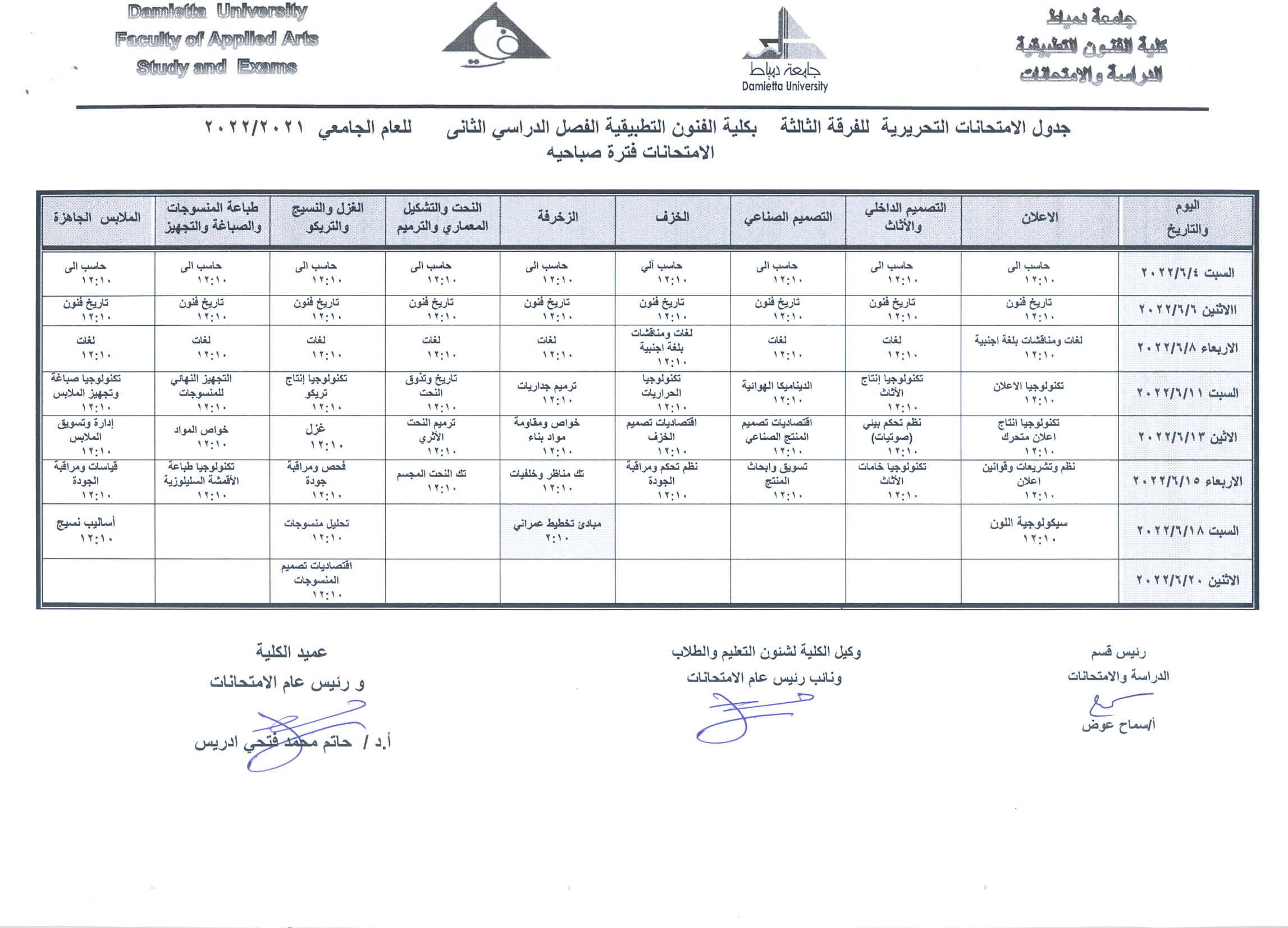 يعلن قسم الدراسة والامتحانات عن جدول امتحانات التحريرية (الفرقة الثالثة) بكلية الفنون التطبيقية