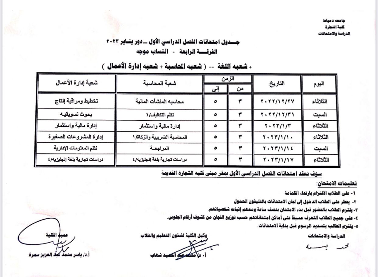 أعلنت إدارة كلية اتلجارة بجامعة دمياط عن جدول امتحانات - االفرقة الرابعة شعبة اللغة ( دور يناير 2023)