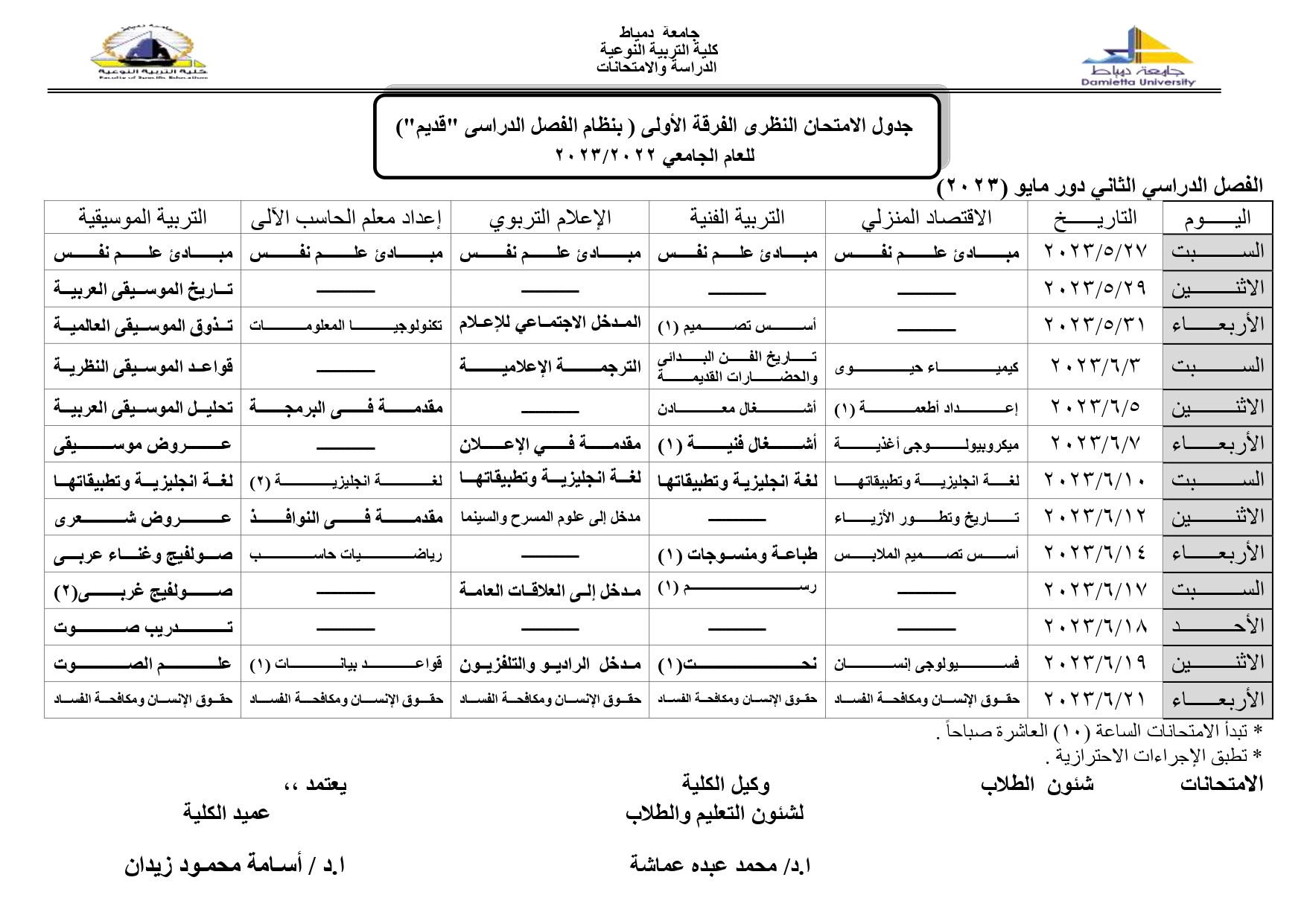 يعلن قطاع شئون التعليم والطلاب بكلية التربية النوعية بجامعة دمياط عن جدول الامتحانات النظرية للفرقة الاولى نظام قديم (مبدئ وقابل للتعديل) للفصل الدراسي الثاني للعام الجامعى 2023/2022