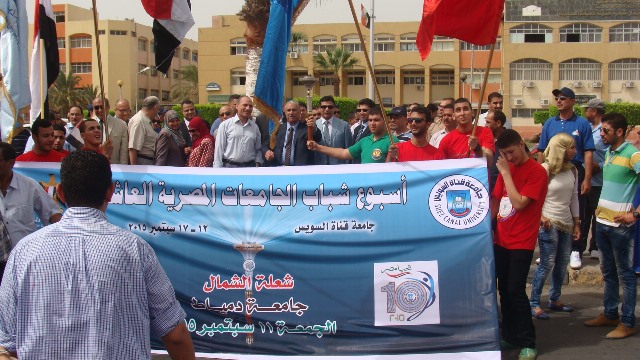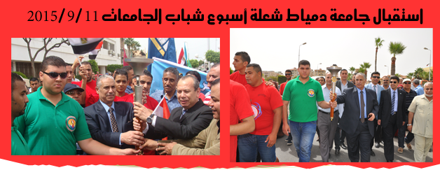 استقبلت جامعة دمياط اليوم الجمعة 11/9/2015 شعلة أسبوع شباب الجامعات العاشر الذي يقام تحت عنوان "بالعلم والشباب تحيا مصر" والمقام بجامعة قناة السويس خلال الفترة من 12 : 17 سبتمبر الجاري، ويشارك فيه أكثر من 7000 طالب وطالبة من جميع الجامعات المصرية، وبدأت الفعاليات باستقبال الشعلة من وفد جامعة دمياط ممثلة في السيد أ.د/ رمضان الطنطاوي – رئيس الجامعة والسادة نواب رئيس الجامعة وأمين عام الجامعة والسادة عمداء الكليات، وبعض من العاملين بالجامعة، حيث تحركت مسيرة شبايبية من طلاب وطالبات الجامعة مع قيادات الجامعة بالتعاون مع مديرية الشباب والرياضة، وانتقل الوفد المشارك في مراسم استقبال الشعلة إلى ديوان عام المحافظة حيث استقبل معالي السيد أ.د.م/ إسماعيل طه السيد أ.د/ رئيس الجامعة والوفد المشارك والمسيرة الشبابية، وأقيم حفل أمام مبنى محافظة دمياط، ثم انتهت المراسم بعقد اجتماع بين معالي المحافظ ومعالي رئيس الجامعة لمناقشة بعض الأمور والقضايا التي تخص بعض القضايا العلمية والمجتمعية، والتي تخدم أبناء محافظة دمياط.