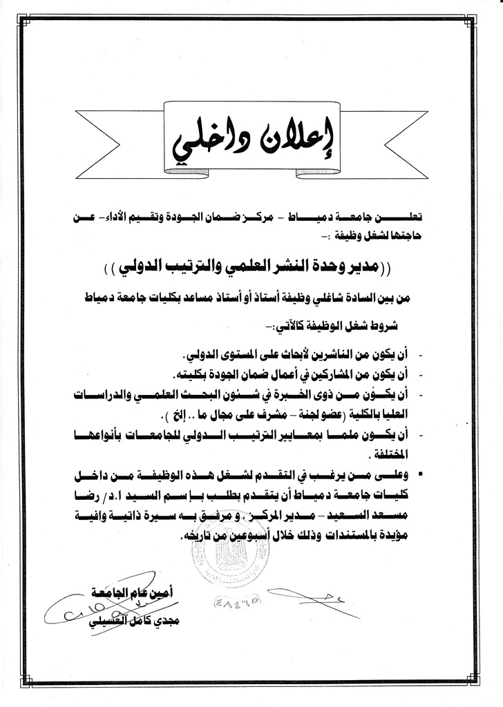 مطلوب: مديرا لـ: وحدة القياس والتقويم &وحدة النشر العلمي والترتيبجامعة دمياط | البوابة الالكترونية
