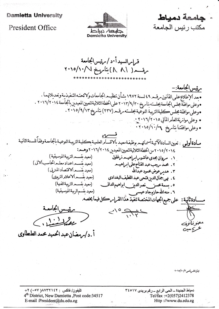 أصدر السيد أ.د/ رمضان الطنطاوي - رئيس الجامعة القرار رقم (881) بتاريخ 2015/10/7، الخاص بتعيين عدد (6) بوظيفة معيد بالأقسام العلمية المختلفة بكلية التربية النوعية، وذلك وفقاً للسنة الثانية 2014/2015 من الخطة الثلاثية لتعيين المعيدين 2014/2016، والقرار على النحو التالي: