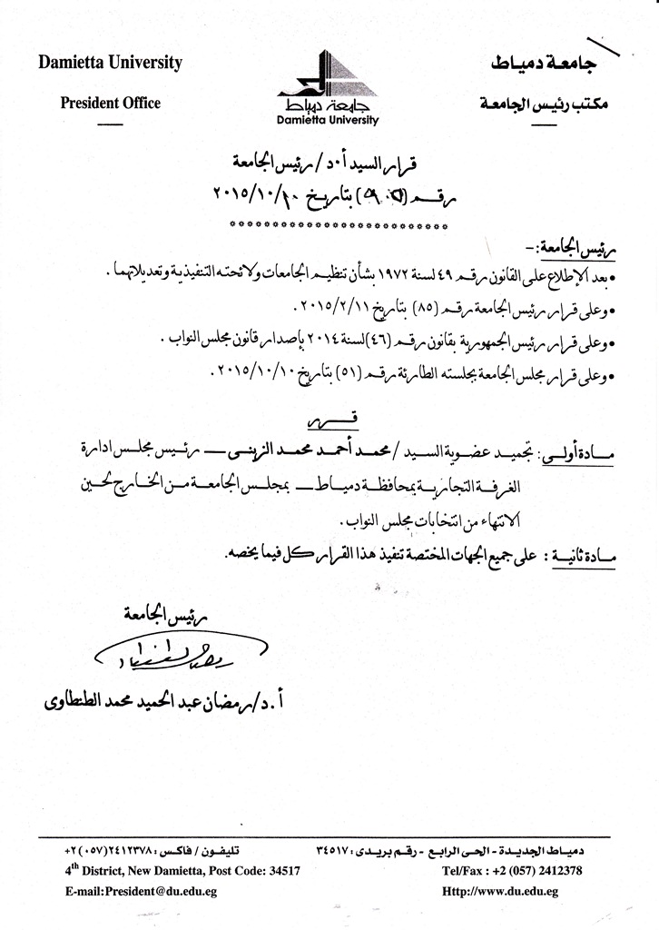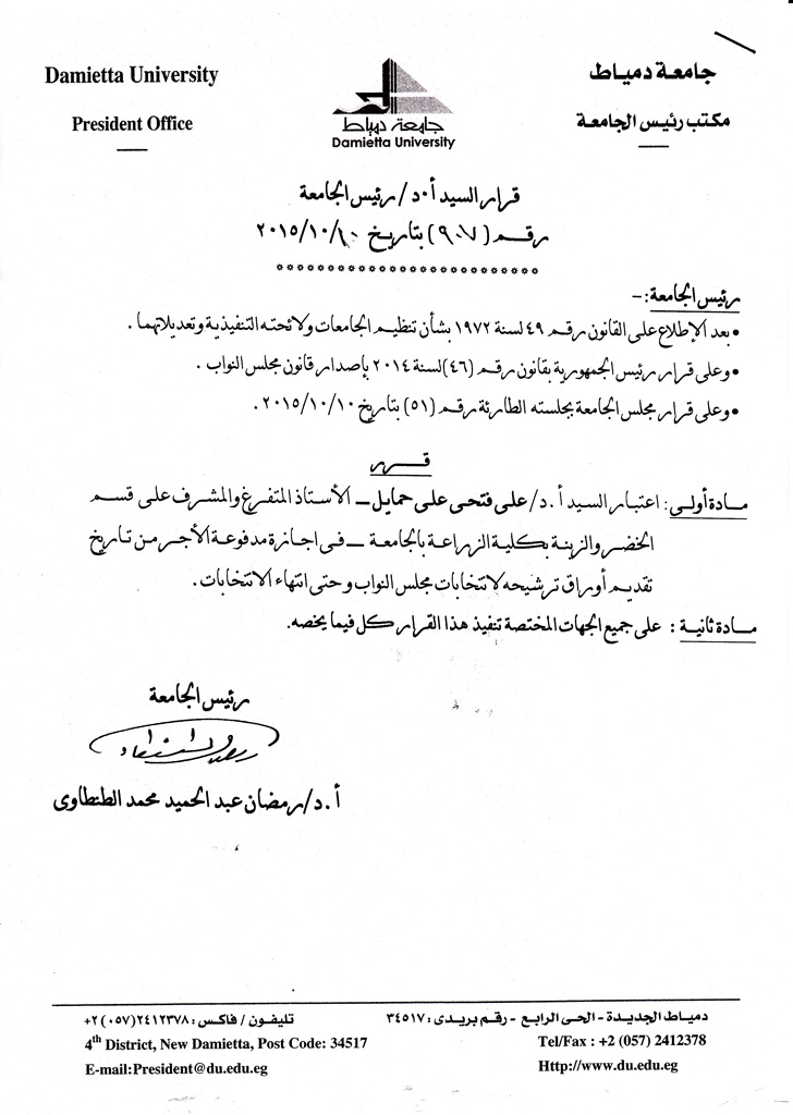 أصدر مجلس الجامعة المنعقد بجلسته الطارئة يوم السبت بتاريخ 2015/10/10 قراراً بالموافقة على منح أجازة مدفوعة الأجر للسادة أعضاء هيئة التدريس بالجامعة المترشحين لعضوية مجلس النواب، وتجميد عضوية السادة أعضاء مجلس الجامعة من الخارج المترشحين لعضوية مجلس النواب، وذلك حتى انتهاء الانتخابات، وفيما يلي القرارات الصادرة في هذا الشأن: