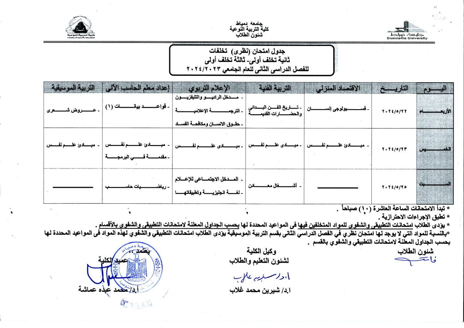 يعلن قطاع شئون التعليم والطلاب بكلية التربية النوعية عن جدول الامتحانات النظرية تخلفات (ثانية تخلف اولي - ثالثة تخلف اولي) للفصل الدراسي الثاني للعام الجامعى 2024/2023