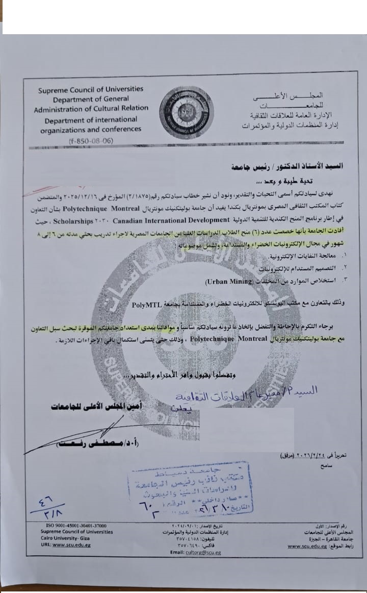 تخصيص 6 منح لطلاب الدرسات العليا لاجراء تدريب بحثي مدتو من 6 الي 8 اشهر في مجال الإلكترونيات الخضراء والمستدامة في إطار برنامج المنح الكندية للتنمية الدولية