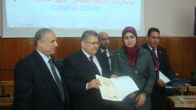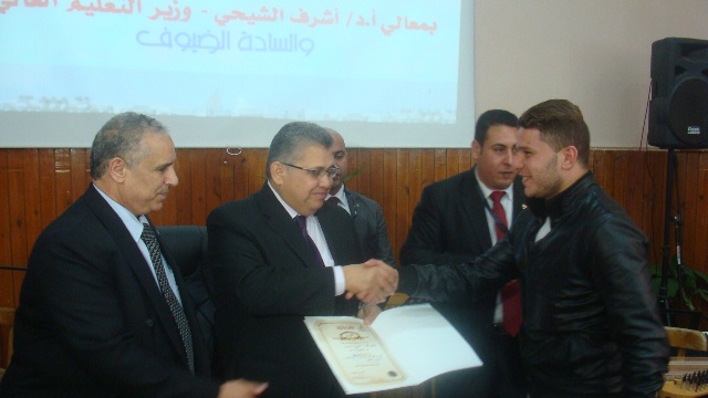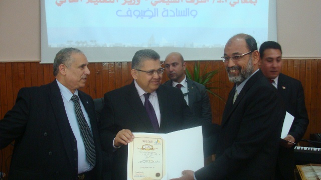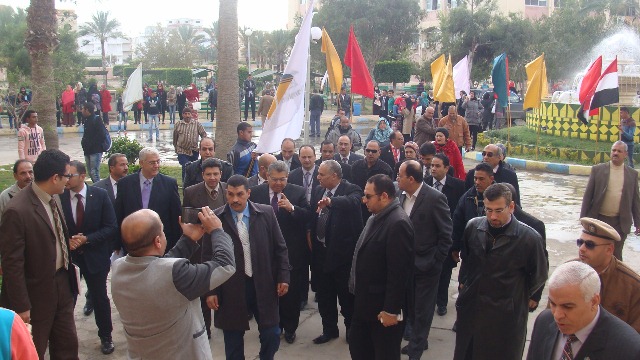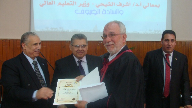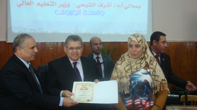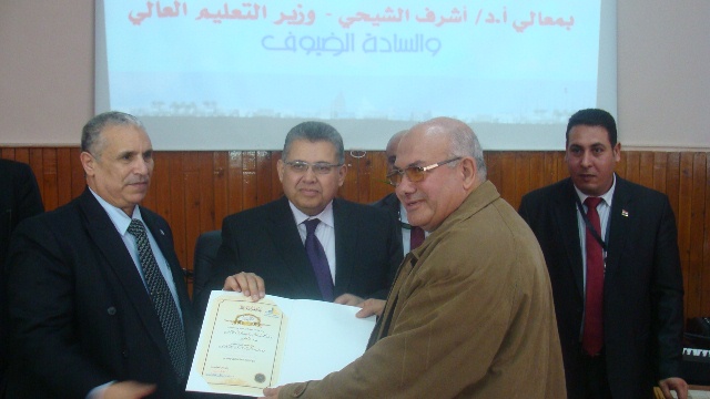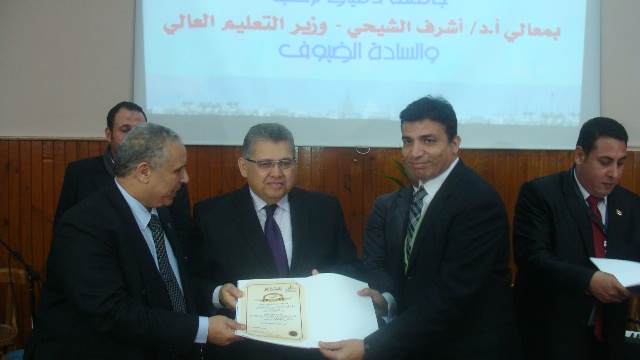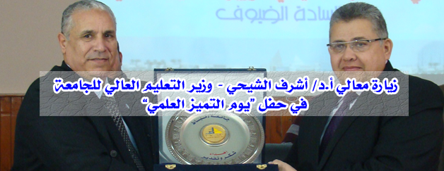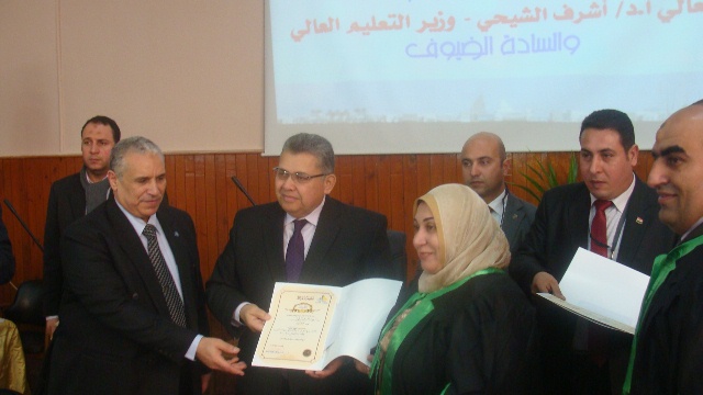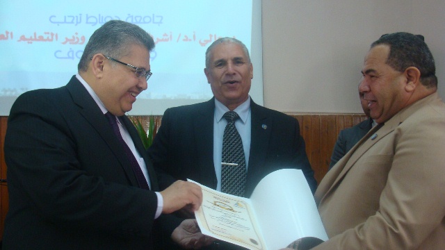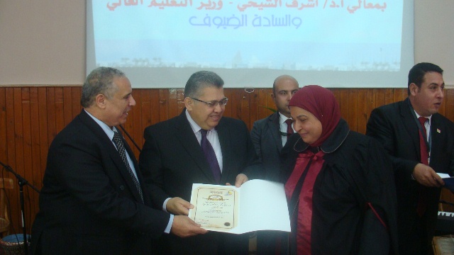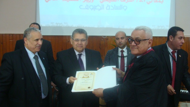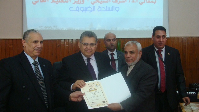 تلي ذلك كلمة معالي الوزير أ.د/ أشرف الشيحي، والذي وجه الشكر في بدايتها للسيد رئيس الجامعة لدعوته لحضور الحفل، وفيما يخص قانون تنظيم الجامعات الجديد أكد معاليه أن القانون الجديد يراعي كل ما يخص أعضاء هيئة التدريس، كما أكد على أنه لا توجد خصومات من مرتباتهم، كما سيتم رد ما تم خصمه خلال الفترة الماضية، وجاري اتخاذ الاجراءات الخاصة بهذا الشأن ومخاطبة كافة الجامعات بعدم الخصم من مرتبات أعضاء هيئة التدريس، وفيما يخص انتخابات اتحاد الطلاب، أكد معاليه أن ما حدث هو شأن طلابي داخلي، وليس للوزارة أو الحكومة أي دخل فيه، فقد تمت عملية الانتخابات بشفافية ونزاهة غير مسبوقة، وإن إبراز الأمر بأن هناك خلاف بين الحكومة والطلاب هو أمر غير عادل، وأكد على ضرورة احترام القوانين وعدم إثارة الفتن. أشار معاليه أيضاً أن ما رآه بحرم الجامعة الجديد هو الأعلى على المستوي الفني والهندسي من جامعات حكومية أخري وكذلك جامعات خاصة، فيعد ذلك بداية متميزة لجامعة ولدت كبيرة ومتميزة وعلى الجامعة أن تُكمل في هذا المسار، وأكد على ضرورة خلق برامج غير نمطية متميزة تحمل طابع خاص للمجتمع المحيط مثل برامج صناعة الجلود والصناعات الغذائية والألبان والثروة السمكية.