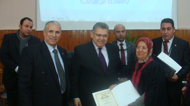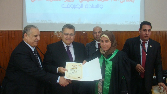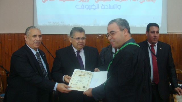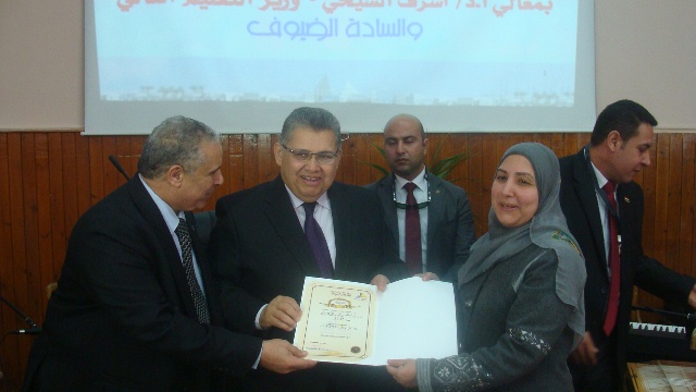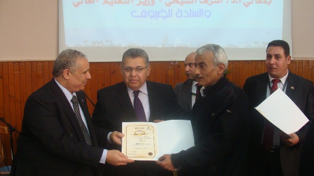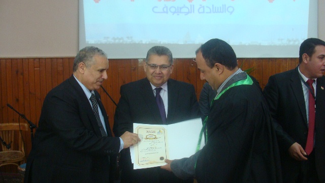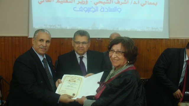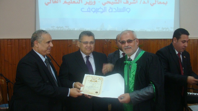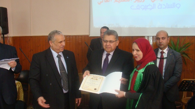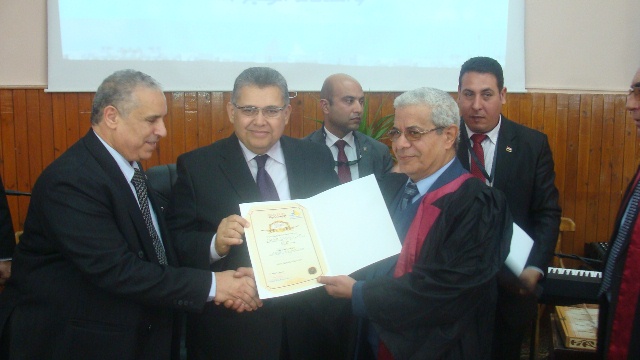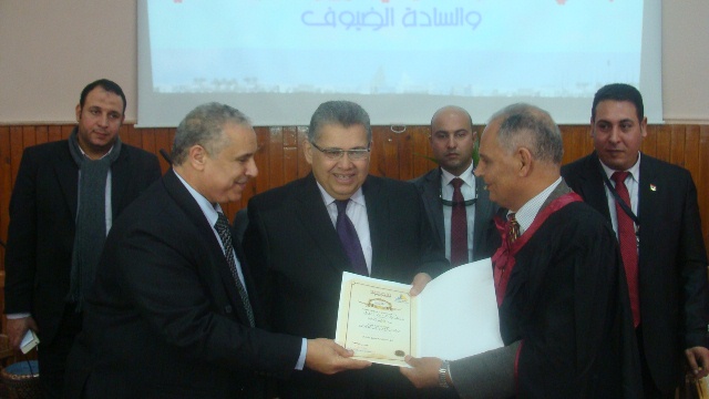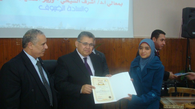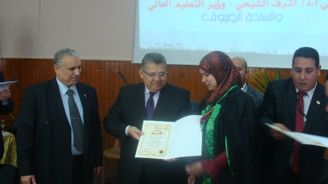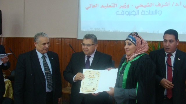 تلي ذلك كلمة معالي الوزير أ.د/ أشرف الشيحي، والذي وجه الشكر في بدايتها للسيد رئيس الجامعة لدعوته لحضور الحفل، وفيما يخص قانون تنظيم الجامعات الجديد أكد معاليه أن القانون الجديد يراعي كل ما يخص أعضاء هيئة التدريس، كما أكد على أنه لا توجد خصومات من مرتباتهم، كما سيتم رد ما تم خصمه خلال الفترة الماضية، وجاري اتخاذ الاجراءات الخاصة بهذا الشأن ومخاطبة كافة الجامعات بعدم الخصم من مرتبات أعضاء هيئة التدريس، وفيما يخص انتخابات اتحاد الطلاب، أكد معاليه أن ما حدث هو شأن طلابي داخلي، وليس للوزارة أو الحكومة أي دخل فيه، فقد تمت عملية الانتخابات بشفافية ونزاهة غير مسبوقة، وإن إبراز الأمر بأن هناك خلاف بين الحكومة والطلاب هو أمر غير عادل، وأكد على ضرورة احترام القوانين وعدم إثارة الفتن. أشار معاليه أيضاً أن ما رآه بحرم الجامعة الجديد هو الأعلى على المستوي الفني والهندسي من جامعات حكومية أخري وكذلك جامعات خاصة، فيعد ذلك بداية متميزة لجامعة ولدت كبيرة ومتميزة وعلى الجامعة أن تُكمل في هذا المسار، وأكد على ضرورة خلق برامج غير نمطية متميزة تحمل طابع خاص للمجتمع المحيط مثل برامج صناعة الجلود والصناعات الغذائية والألبان والثروة السمكية.