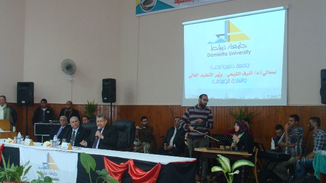 عقب ذلك، توجه وفد الزيارة لكلية التربية، حيث افتتح معاليه المعرض الفني الذي تنظمه كليتي الفنون التطبيقية والتربية النوعية بالإنتاج العملي لطلاب الكليتين، ثم بدأت مراسم حفل يوم التميز العلمي حيث بدأت الفعاليات بعزف النشيد الوطني ثم القرآن الكريم، فكلمة السيد رئيس الجامعة التي وجه فيها الشكر لمعالي الوزير لقبوله الدعوة وحضور الحفل، ثم أوجز سيادته ما قامت به إدارة الجامعة الفترة الماضية من مجهودات مختلفة في كافة الملفات سواء الانشاءات التي قطعت الجامعة شوطاً ملموساً ومرئياً للجميع في كافة المراحل، وكذلك ملف الكليات المزمع إنشاؤها والجاري دراستها بلجان القطاع المختصة بالمجلس الأعلى للجامعات، كما أشار سيادته إلى الموافقة الأخيرة من وزارة المالية بتخصيص 25000 م2 حيث تقوم الجامعة حالياً بمخاطبة جهاز تنمية مدينة دمياط الجديدة لنقل أصول تلك المساحة المخصصة لجامعة دمياط لتصبح نواة المستشفى الجامعي، كما استعرض سيادته أيضاً الموافقة الخاصة بنقل أصول عدد (3) عمارات للجامعة التي تمت الموافقة عليهم نهاية الأسبوع الماضي والتي سيتم تجهيزهم كتوسعة للمدن الجامعة وإدارة الجامعة حيث يشهد مبني إدارة الجامعة الحالي تكدس للجهاز الإداري مع العلم أن الجهاز الإداري يعمل بطاقة من الطاقة المفترض العمل بها.