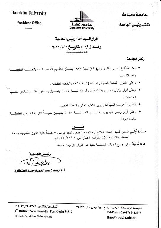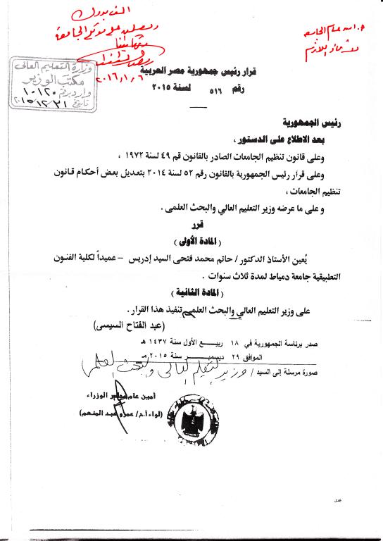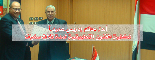 صدر قرار السيد رئيس الجمهورية رقم (516) بتاريخ 29/12/2015 الخاص بتعيين أ.د/ حاتم محمد فتحي السيد إدريس عميداً لكلية الفنون التطبيقية لمدة ثلاث سنوات، وبناءً عليه أصدر اليوم الأربعاء الموافق 6/1/2016م السيد أ.د/ رمضان الطنطاوي- رئيس الجامعة القرار التنفيذي رقم (14)، الخاص بتعيين أ.د/ حاتم محمد فتحي السيد إدريس عميداً لكلية الفنون التطبيقية.