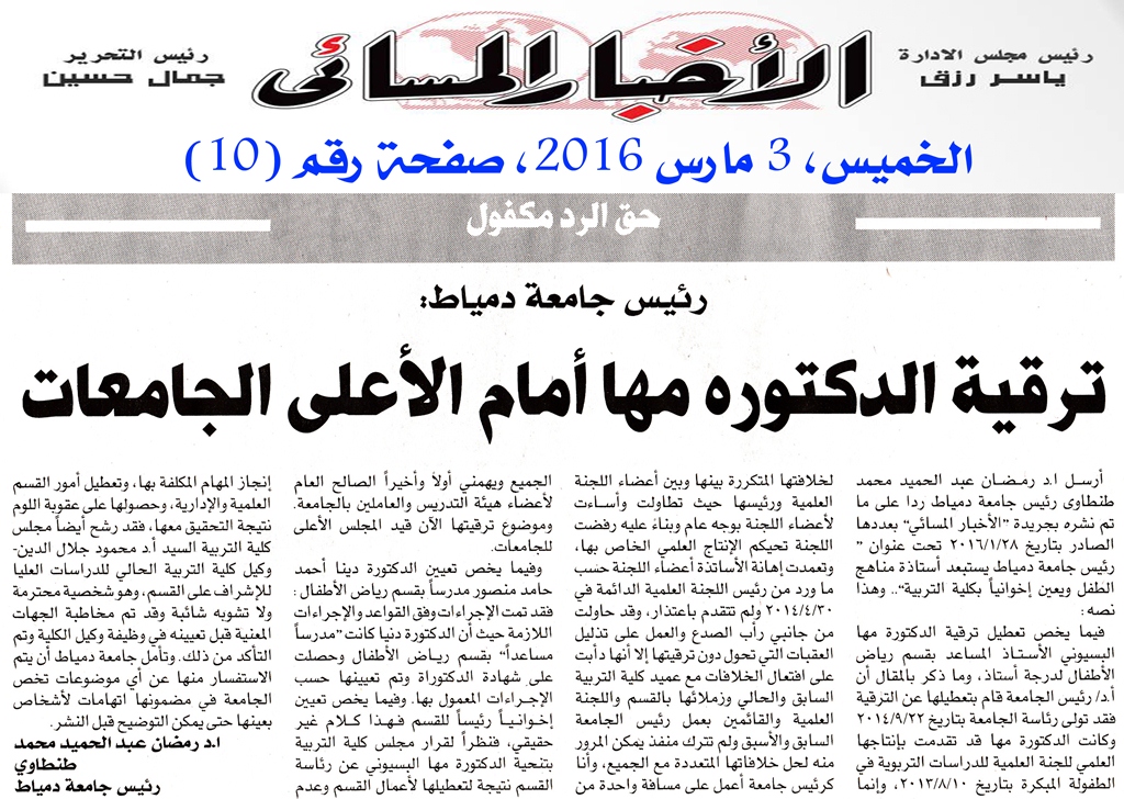 في إطار كشف الحقائق، وسياسة الشفافية التي تنتهجها إدارة الجامعة، وكذلك حق الرد على أي أخبار مغلوطة يتم نشرها عن الجامعة، نشرت جريدة الأخبار المسائي اليوم الخميس الموافق 3/3/2016 رد الجامعة فيما يتعلق بالمقال الذي نشر بالجريدة ذاتها بتاريخ 2016/1/28، وذلك على النحو التالي: