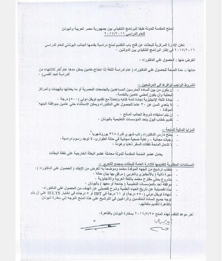 تعلن الإدارة العامة للبعثات عن فتح باب التقدم لمنح دراسية يقدمها الجانب اليوناني للعام الدراسي 2016/2017 في إطار البرنامج التنفيذي بين الدولتين للحصول علي درجه الدكتوراه