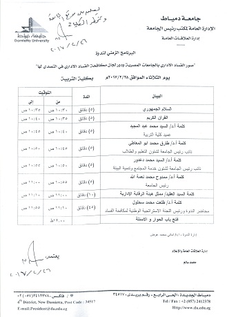 البرنامج الزمني لندوة (صور الفساد الإداري بالجامعات المصرية )جامعة دمياط | البوابة الالكترونية