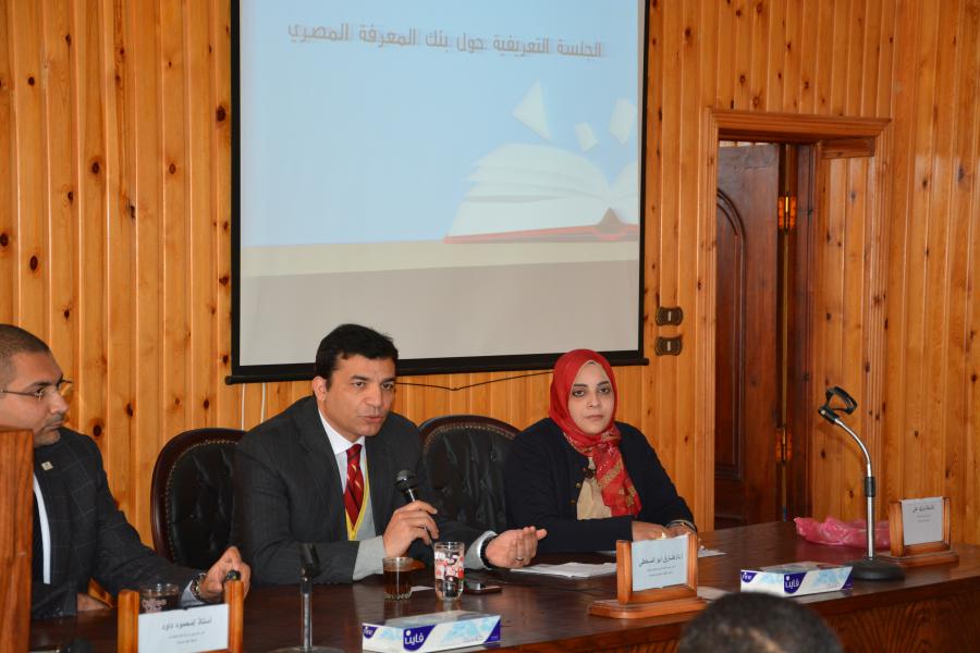 تم عقد اليوم الاثنين الموافق 27/2/2017 الجلسة التدريبة علي بنك المعرفة المصري بالتعاون مع وحدة المكتبة الرقمية بالمجلس الأعلى للجامعات ومشروع المكتبة الرقمية بالجامعة بقاعة المؤتمرات بكلية العلوم وبحضور السيد الاستاذ الدكتور / طارق محمد ابو المعاطي نائب رئيس الجامعة لشئون التعليم والطلاب والمدير التنفيذي للمعلومات بالجامعة وقام بالتدريب كلا من أ/ محمود داود مدير التدريب والتسويق بشركة نظم المعلومات المنفذ لبنك المعرفة ومنسق التدريب لبنك المعرفة المصري ، أ/ وليد علي أخصائي إدارة قواعد البينات بالمجلس الأعلى للجامعات واكد السيد الاستاذ الدكتور / طارق محمد ابو المعاطي نائب رئيس الجامعة لشئون التعليم والطلاب علي اهمية استخدام قواعد البيانات ببنك المعرفة المصري في تفعيل البحث العلمي بالجامعة كما أكدت د/ عبير عباس علي اهمية الاستفادة من التوعية الثقافية المعلوماتية المتاحة من خلال الجلسات التدريبة في تفعيل دورة المعارف بدءاً من اتخاذ لمصدر المعلومات منها في توليد معرفة جديدة لحل المشاكل والقضايا بالمجتمع