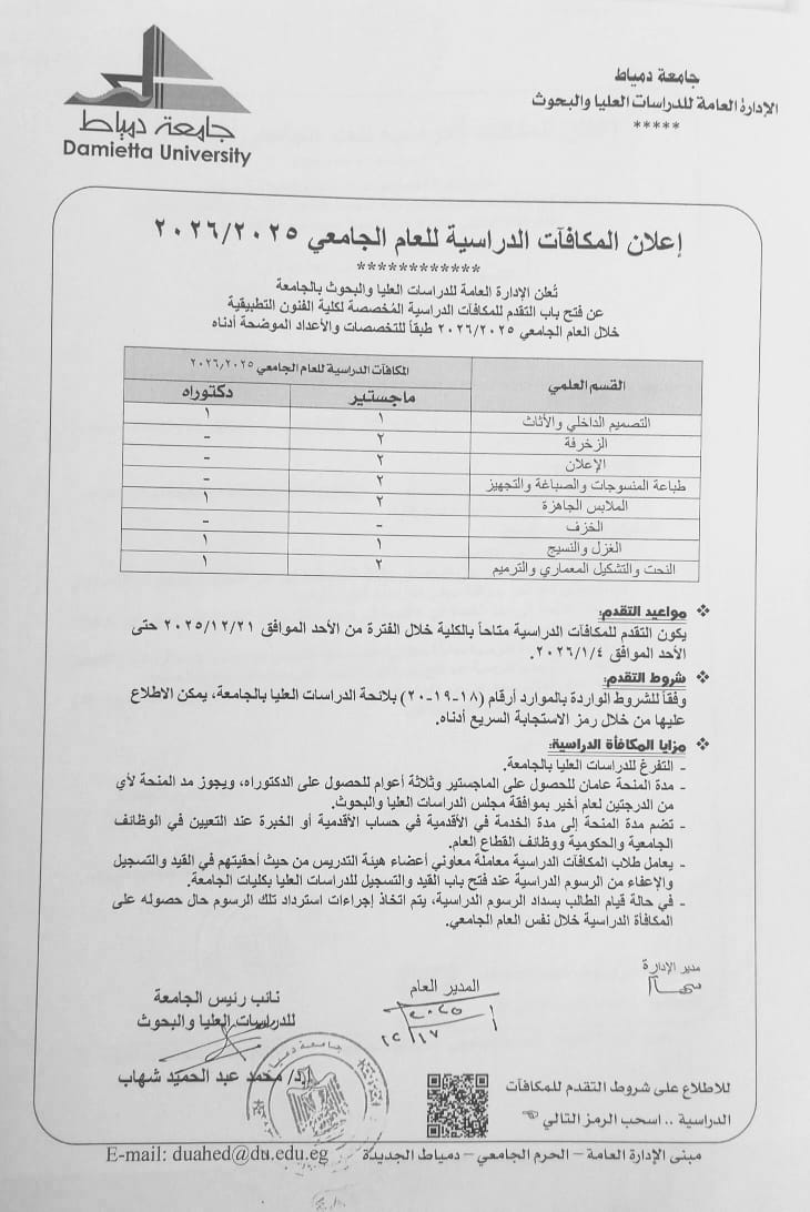 يعلن قطاع الدراسات العليا والبحوث بكلية الفنون التطبيقية - جامعة دمياط عن فتح باب التقدم عن المكافآت الدراسية المخصصة لكلية الفنون التطبيقية للعام الجامعى 2025/2026