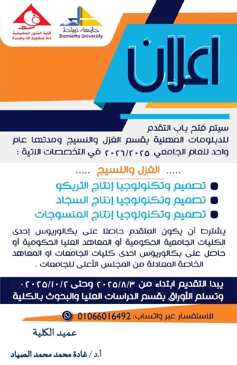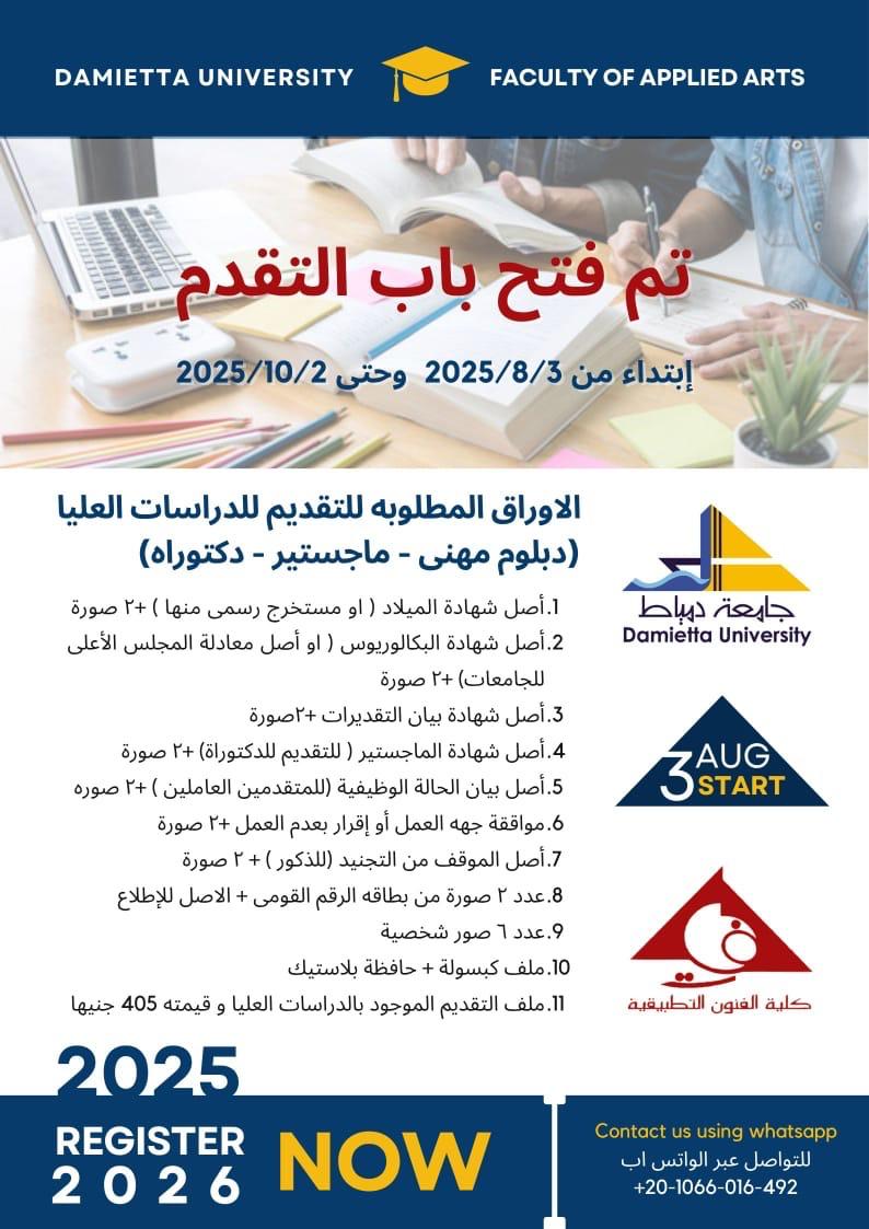يعلن قطاع شئون الدراسات العليا والبحوث قسم الدراسات العليا بكلية الفنون التطبيقية جامعة دمياط عن فتح باب التقدم للدراسات العليا لخريجى كلية الفنون التطبيقية لمرحلة (الدبلومات المهنية - الماجيستير - الدكتوراه ) للعام الجامعى 2025/2026.