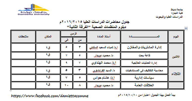 جدول محاضرات الدراسات العليا 2015/2016م دبلوم المنظمات الصحية "الفرقة الثانية"