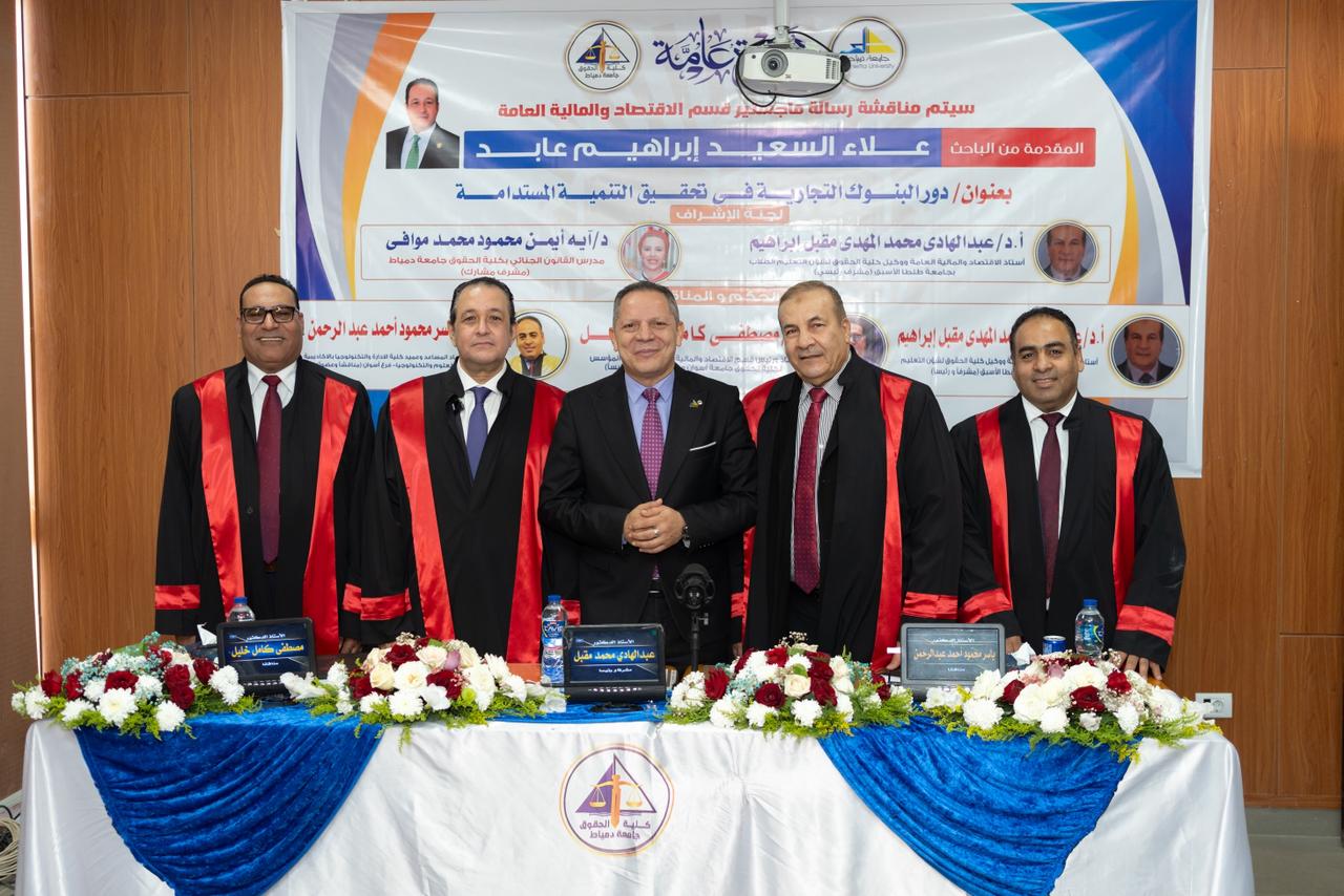 شهد الأستاذ الدكتور حمدان ربيع، رئيس جامعة دمياط، مناقشة رسالة الماجستير المقدمة من الباحث علاء السعيد إبراهيم عابد، لنيل درجة الماجستير في الحقوق، تخصص الاقتصاد والمالية العامة بكلية الحقوق جامعة دمياط، وذلك عن رسالته المعنونة: